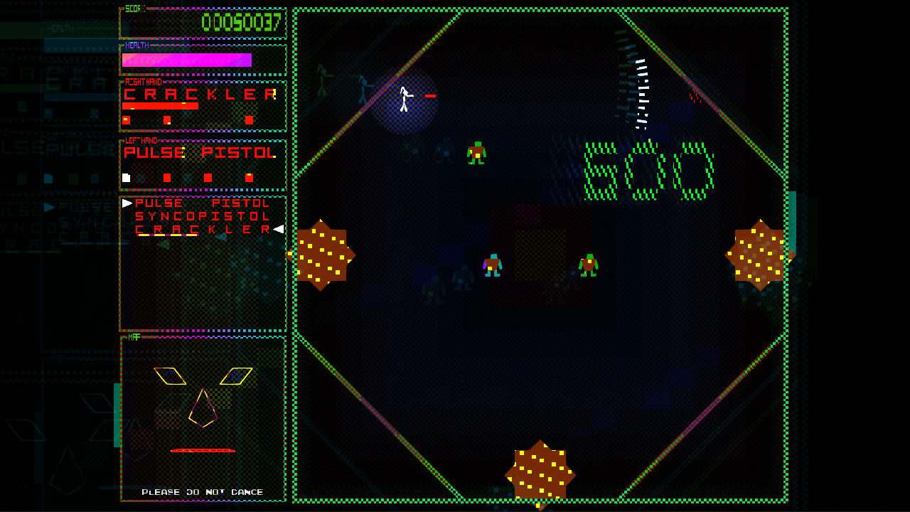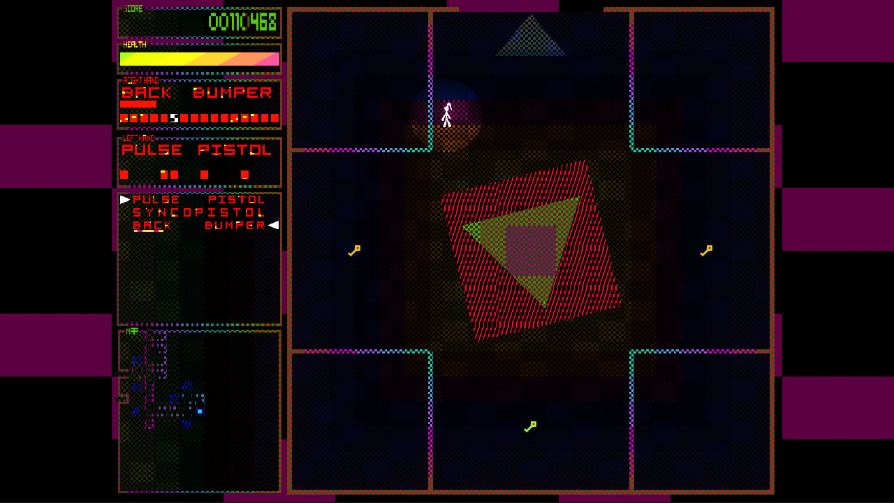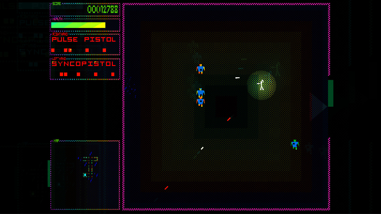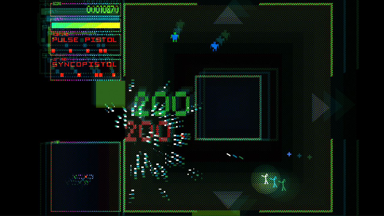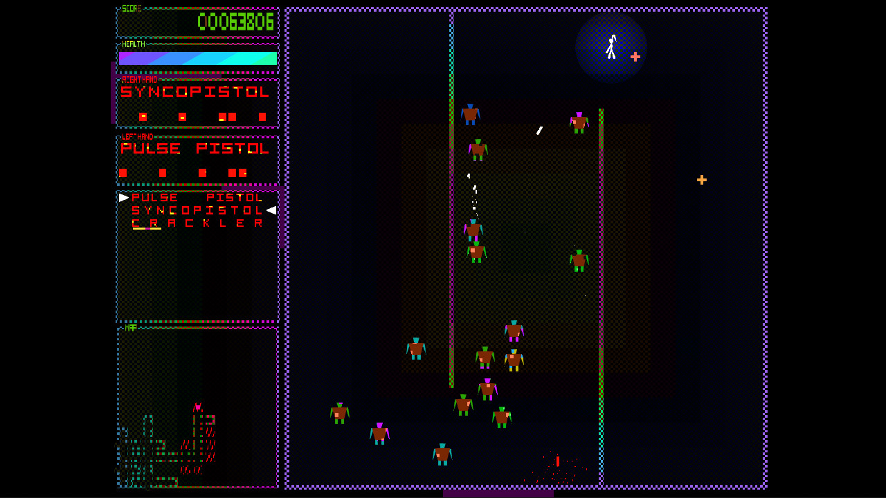 Each weapon you pick up automatically fires to its own rhythm and is synchronized to the game's music.