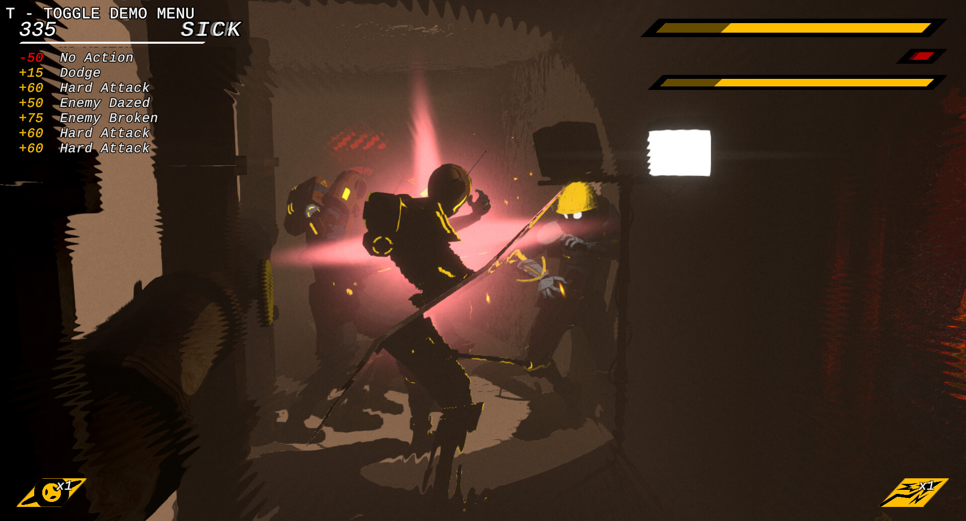Combat in Raw Metal is fast and punishing. The guards stationed at Katabase 6 are stronger and more heavily armored than you, so fighting them head on will take skill cunning, and a great degree of risk. However, mastering combos and using your environment will allow you to come out on top, and yield far greater rewards. Depending on whether it is initiated through a clever ambush or a stealth slip-up, combat can range from a calculated risk to a desperate fight for survival.