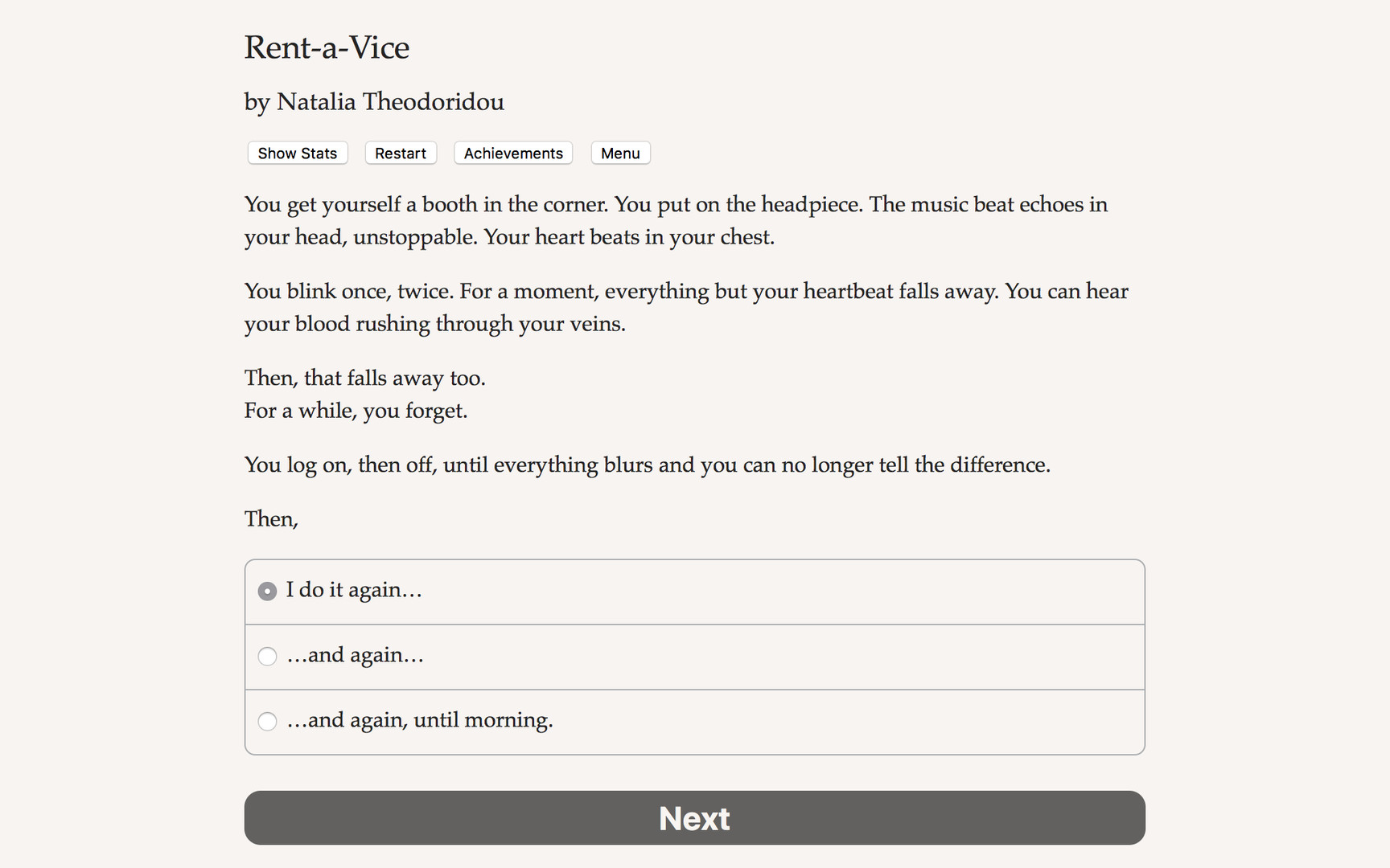 Rent-a-Vice is a 150,000-word interactive cyberpunk-noir mystery novel by Natalia Theodoridou, where your choices control the story. It's entirely text-based—without graphics or sound effects—and fueled by the vast, unstoppable power of your imagination.