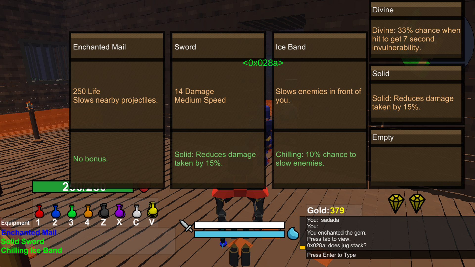 * Dynamic Potion System - Eight randomized potions chosen each game from 17 types (two are always healing). - Each potion is learned for the remainder of the game after using them on yourself, an enemy or an ally. - A person in town will sell you potions to help offset your bad luck finding them.