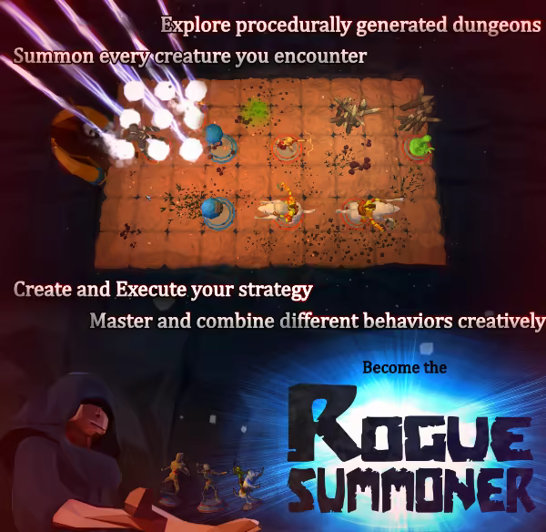 Rogue Summoner is a turn-based tactics roguelike about conjuring creatures to fight for you. It's a game about mastering different monster behaviors and using them creatively in combat.