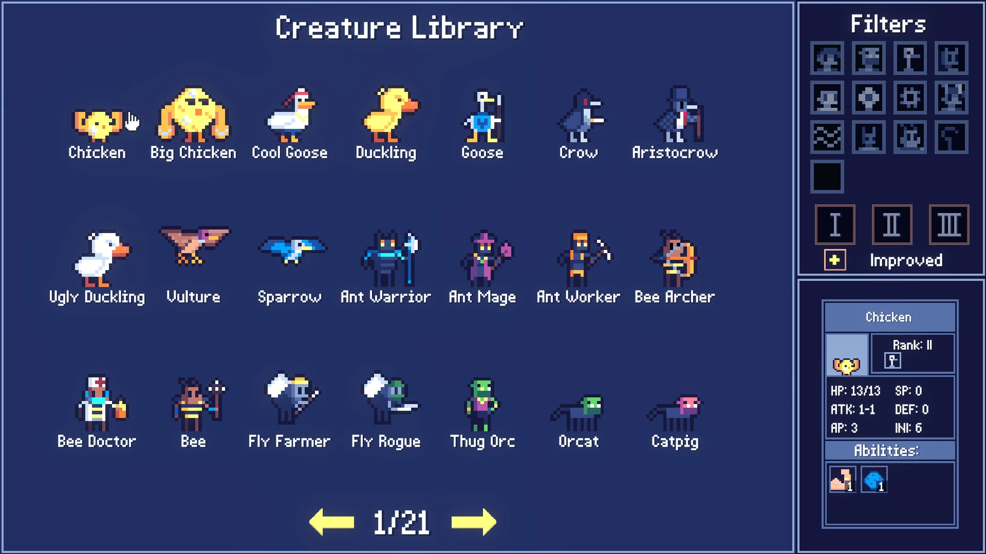 Rogue Tactics is a turn-based tactical roguelike. Collect different creatures into your squad, strengthen them, and combine them into more powerful ones. Learn new spells and find powerful artifacts.