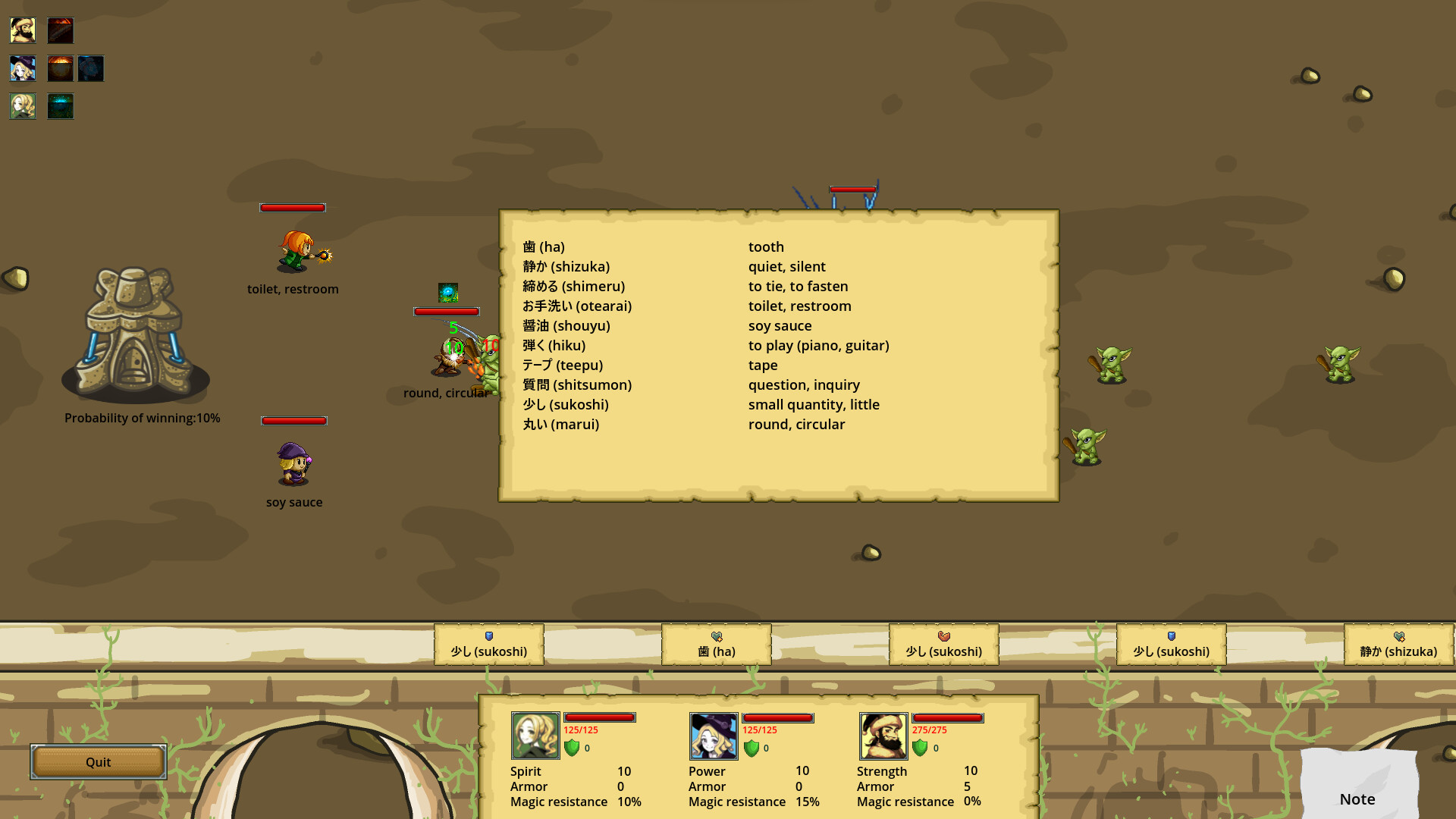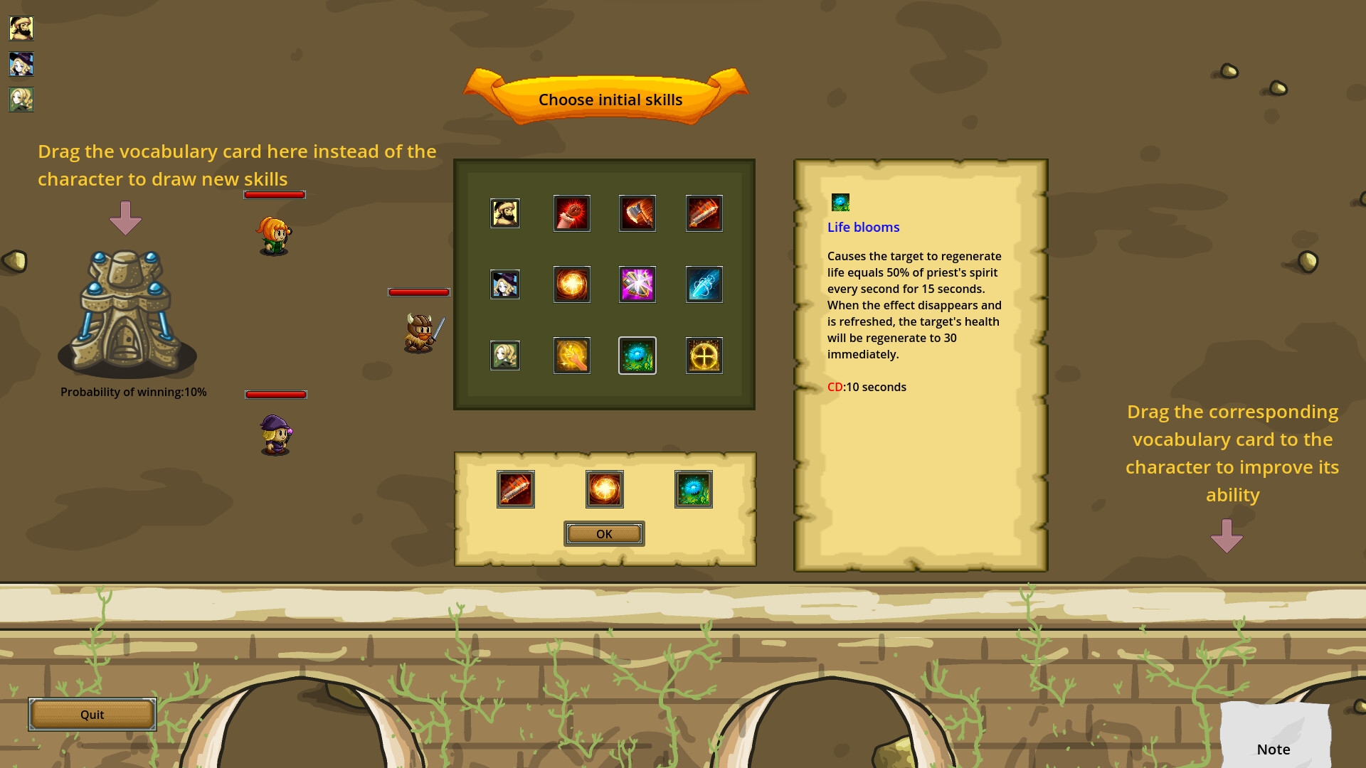 In this game, you can use the foreign vocabulary you have mastered (and soon will master) to strengthen your three characters. By dragging word cards, you can build an indestructible combination of the warrior, the mage and the priest. In the world of monsters, dragons, and magic, resist the incoming powerful enemies and survive tenaciously.