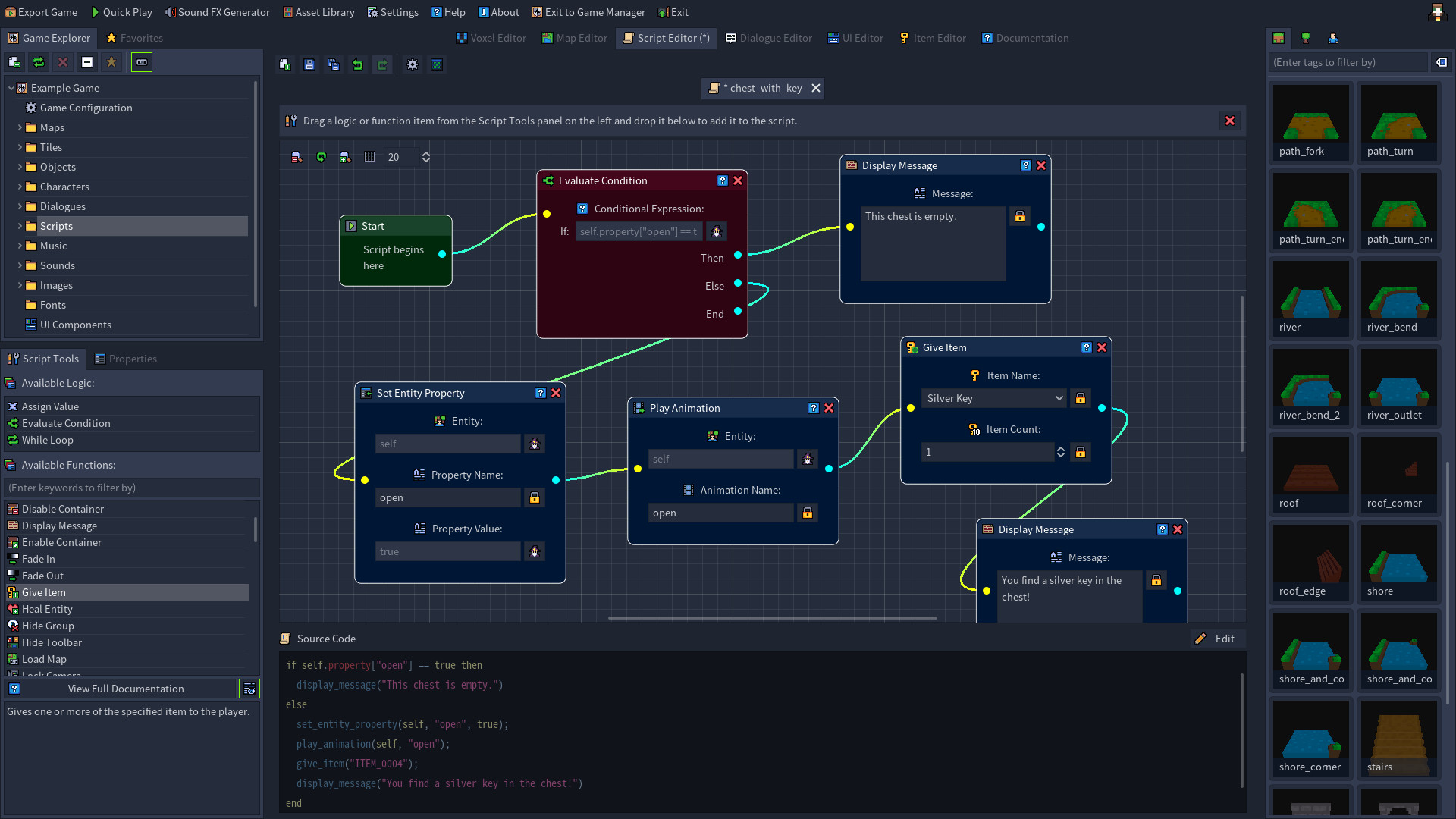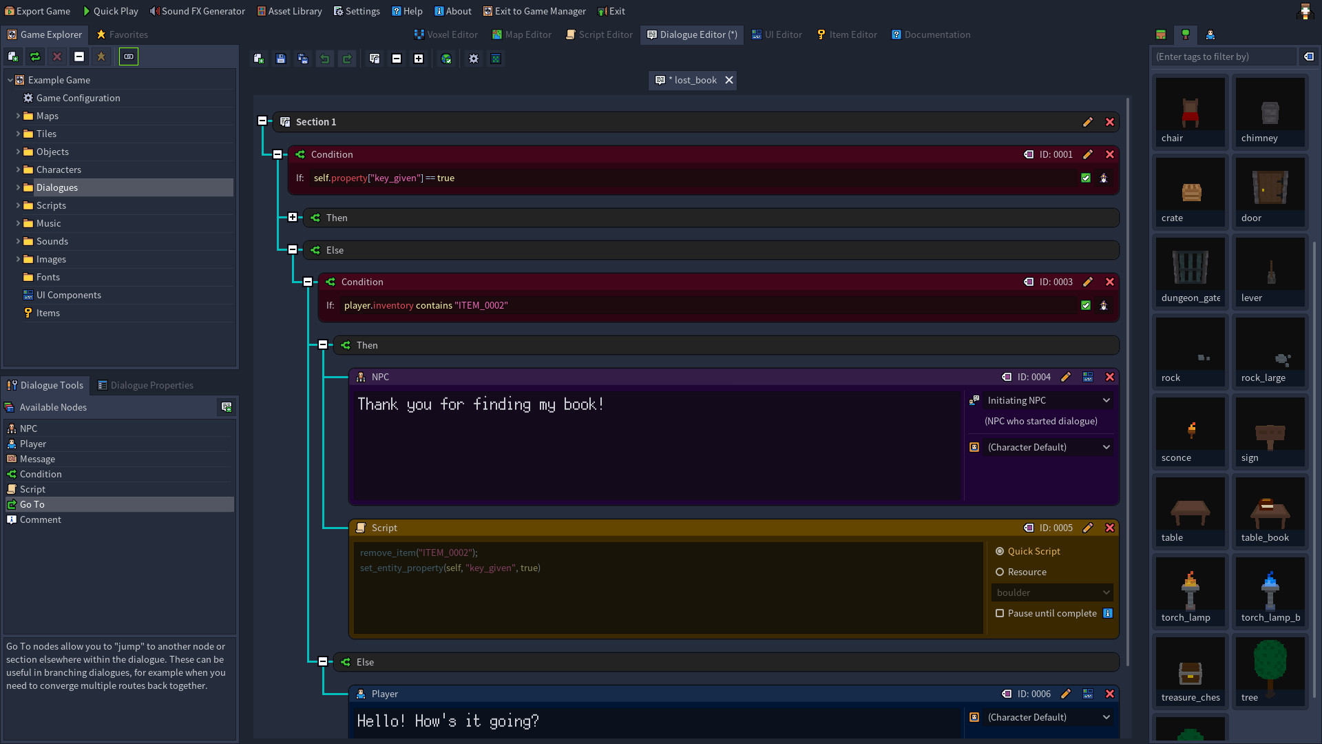 Write conversations for your NPCs using a visual, flowchart approach similar to that of the script editor. Branching dialogue is supported via player choices and condition checking.