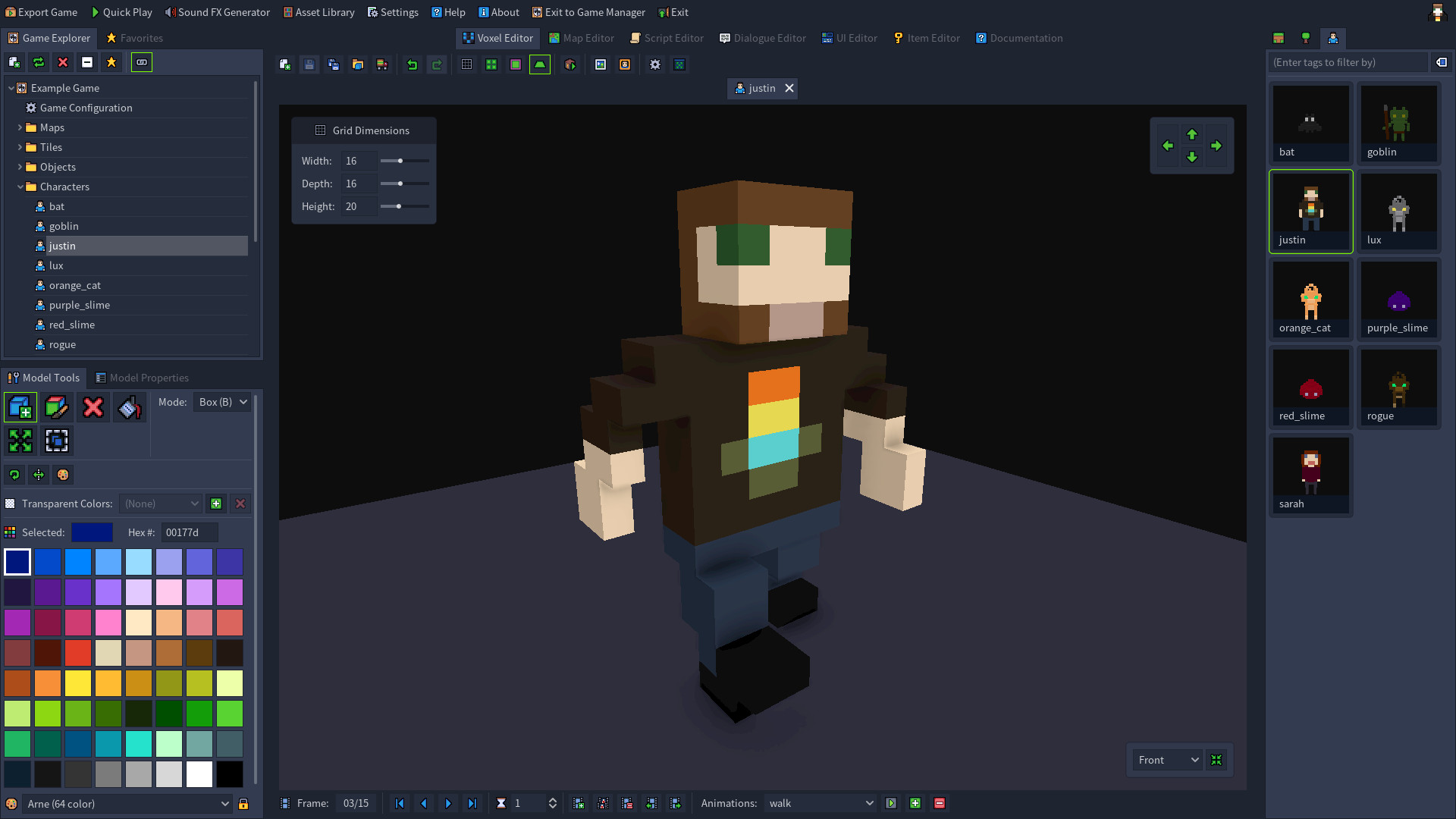 Build tiles, objects, and characters from 3D pixel blocks (i.e. voxels) and easily animate them with the editor's frame-based, stop-motion animation system. Importing from MagicaVoxel (.vox) and Qubicle (.qb) is also supported.