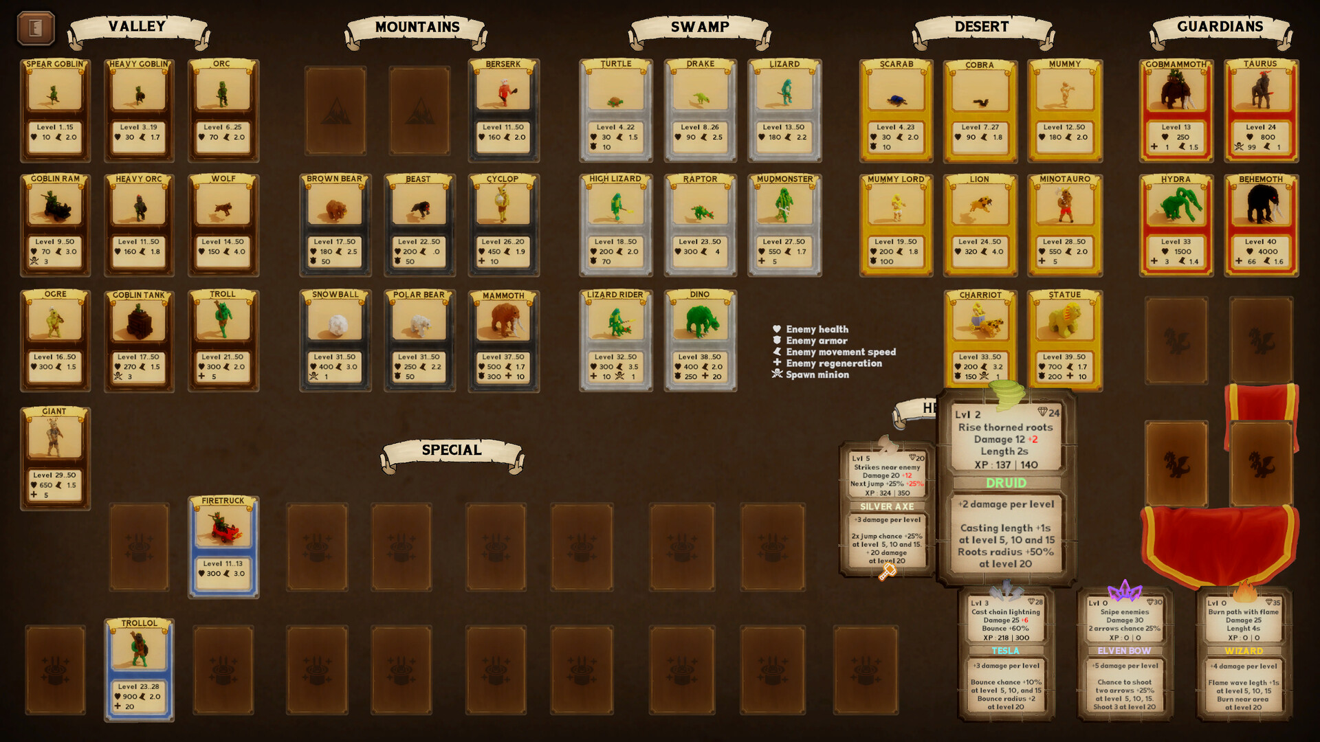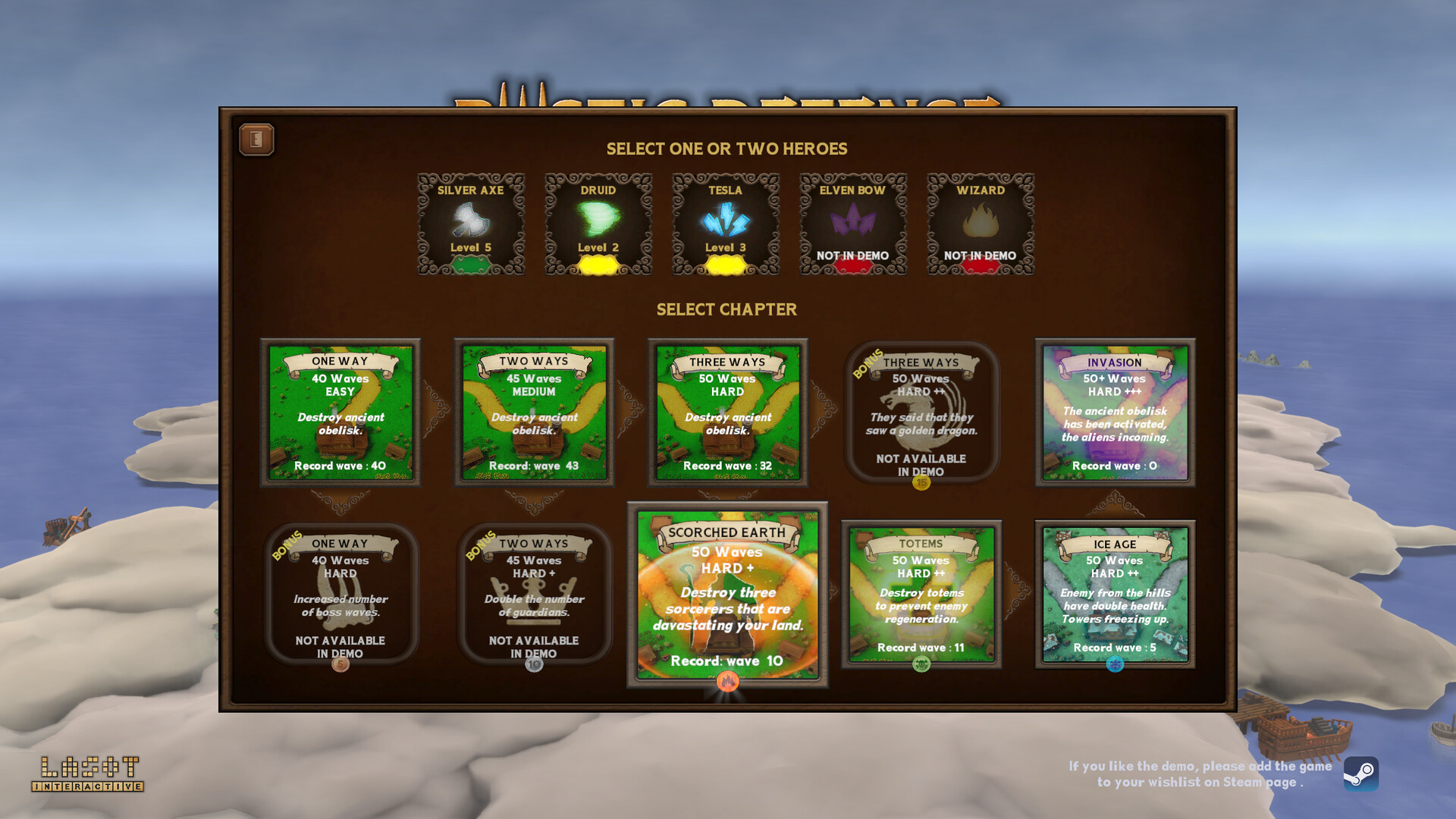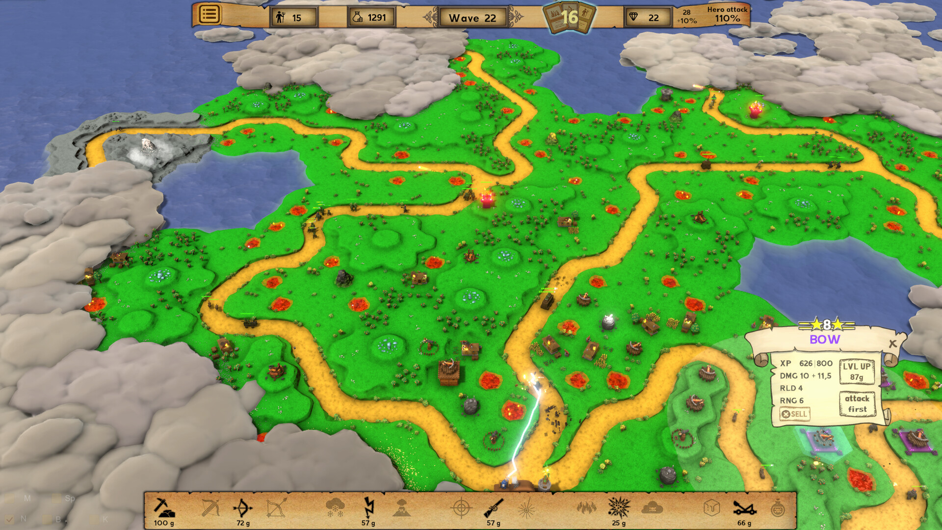 Rustic Defense is a fantasy tower defense game with roguelike elements, generated enviroment with option explore your own way. Research skills and heroes, choose path, build towers and upgrade them.