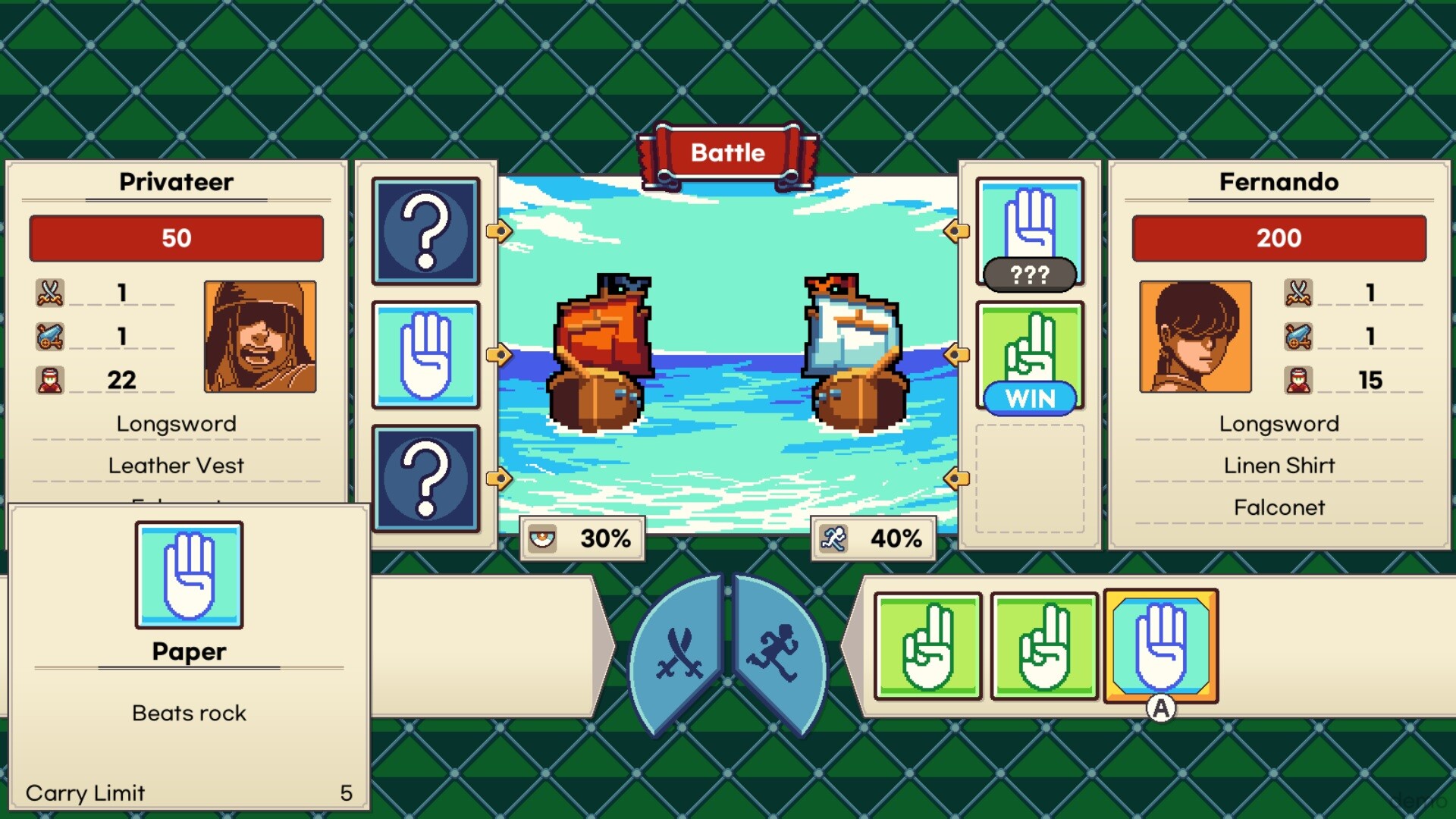 Fight against pirates, thieves, wild animals and mythic creatures with a unique "rock-paper-scissors" style turn-based combat system.