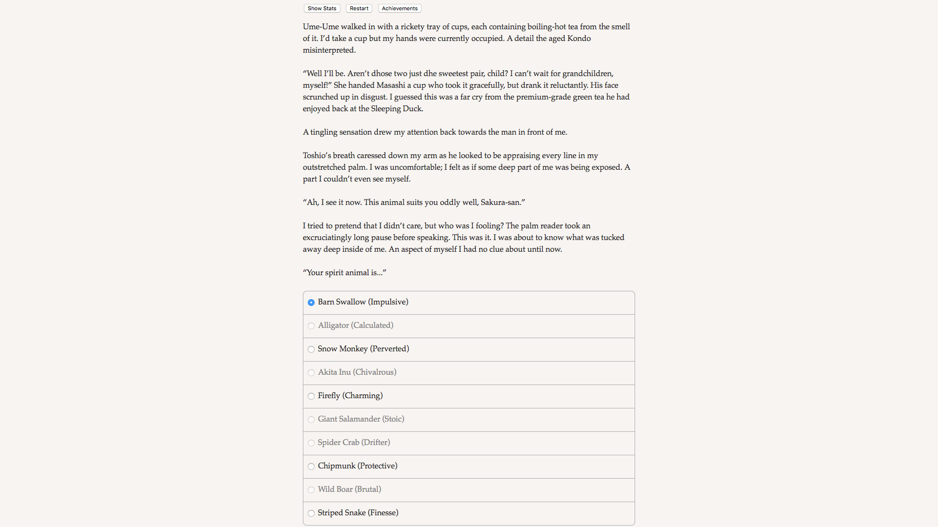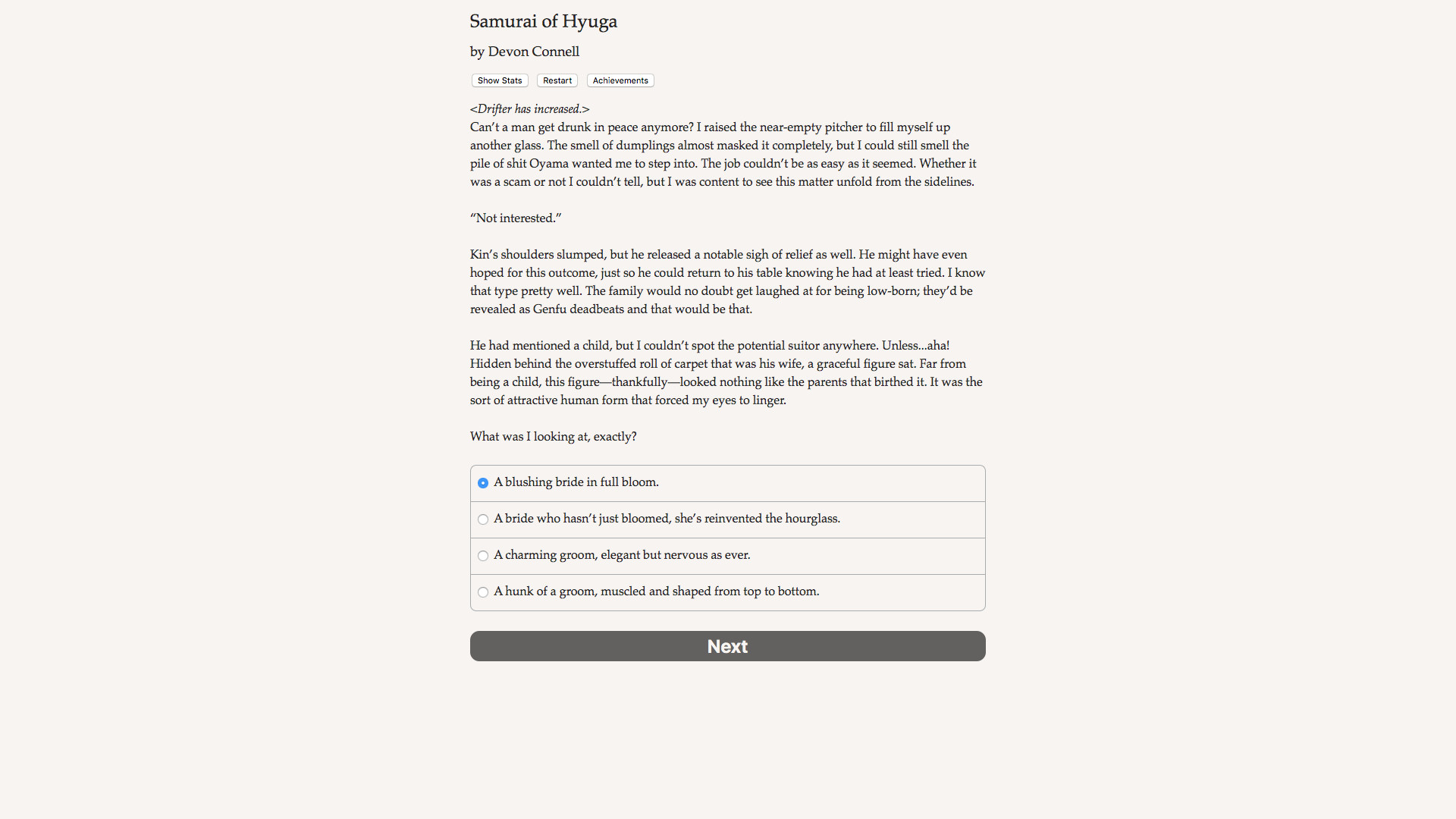 "Samurai of Hyuga" is a 135,000-word interactive fantasy novel by Devon Connell, where your choices control the story. It's entirely text-based--without graphics or sound effects--and fueled by the vast, unstoppable power of your imagination.