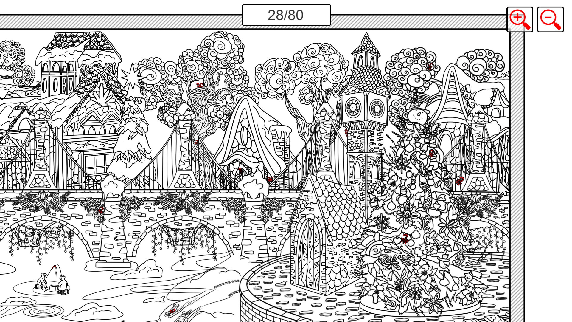 is a game in the genre of "hidden object", in which you need to find all the Christmas candy in the form of a cane (caramel cane) on a large location drawn in the style of "doodling". The location depicts a winter city. In the foreground of the location is a railway, along which a locomotive periodically passes. Also in the foreground is a carousel with horses, and next to it children are making a snowman. In the middle there is a frozen pond where people are doing their favorite things, someone is skating, and someone is fishing. Between the front layer of the location and the back, there is a huge bridge along the entire settlement. In the background, a viewing wheel rotates and there is a large apartment building.