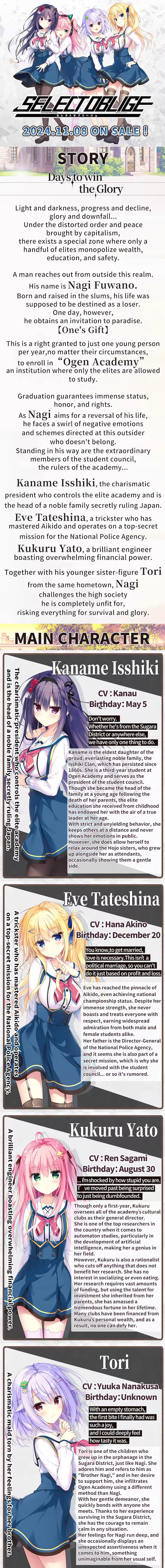 Select Oblige features character design and artwork by renowned illustrator Hiyo Yuzuna, with the story crafted by Shoukei Wakaba. The main heroines are voiced by popular voice actresses Hana Akino, Kanau, Ren Sagami, and Yuuka Nanakusa. The theme song is performed by the well-known singer Faylan.