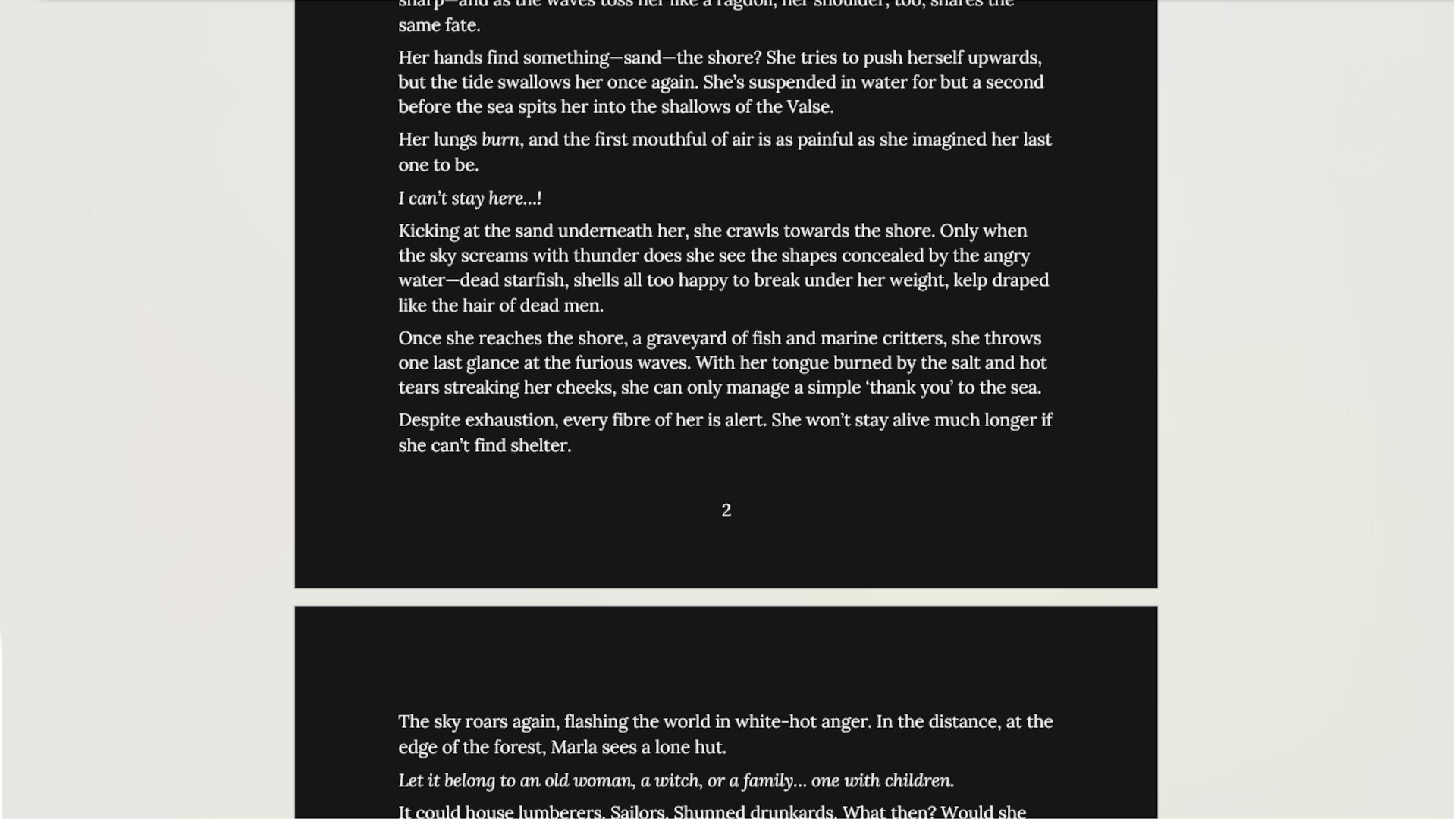 Salt on her skin — Years before the founding of Carolise, a fisherwoman flees from Fiorella on a rowboat and meets an alchemist on the outskirts of LaMarina.