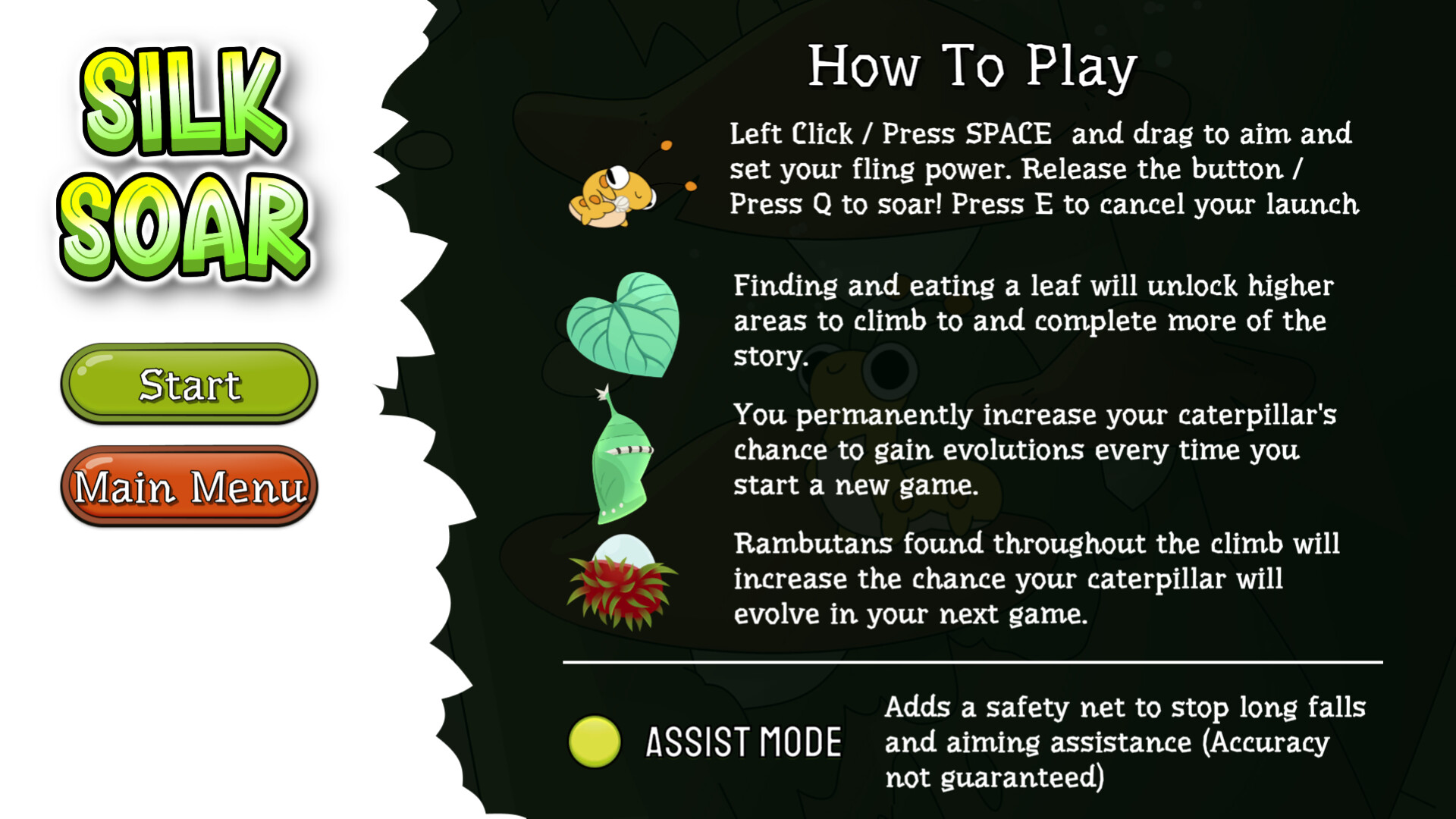 Tumbles (Previously Silk Soar) is a Physics Flinging, Rage Bringing Narrative 2D Platformer (Foddian), where you take on life as a newborn caterpillar attempting to meet the challenges of flinging yourself from the rainforest floor to the top of the canopy.