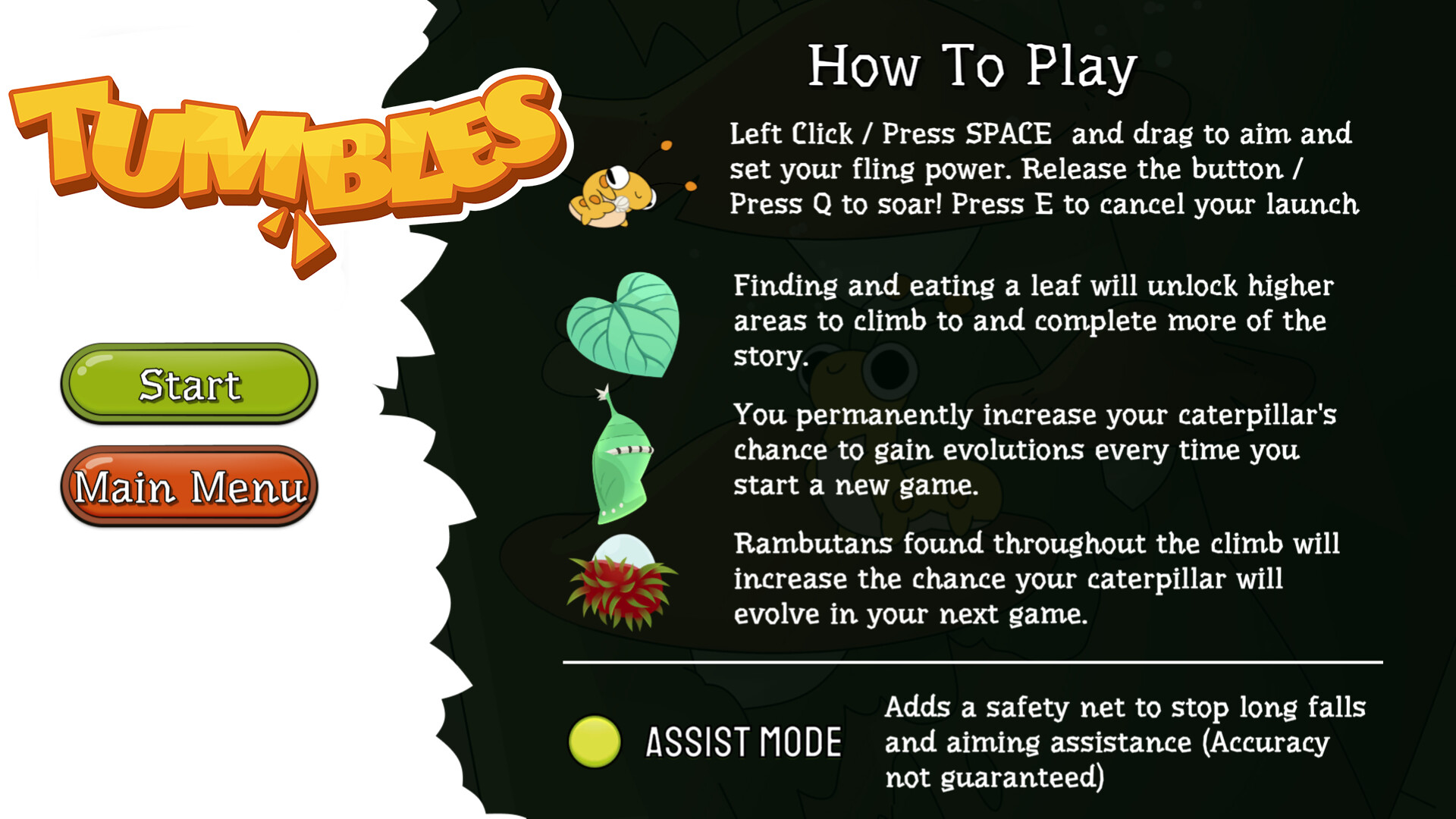 Tumbles is a Physics Flinging, Rage Bringing Narrative 2D Platformer, where you take on life as a newborn caterpillar attempting to meet the challenges of flinging yourself from the rainforest floor to the top of the canopy.
