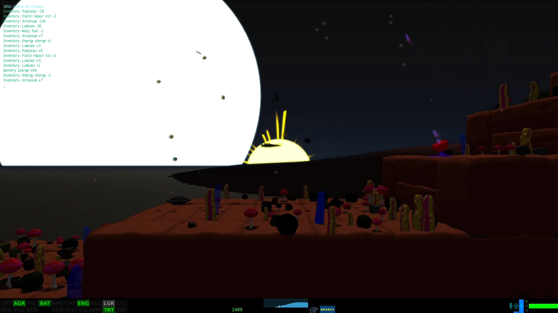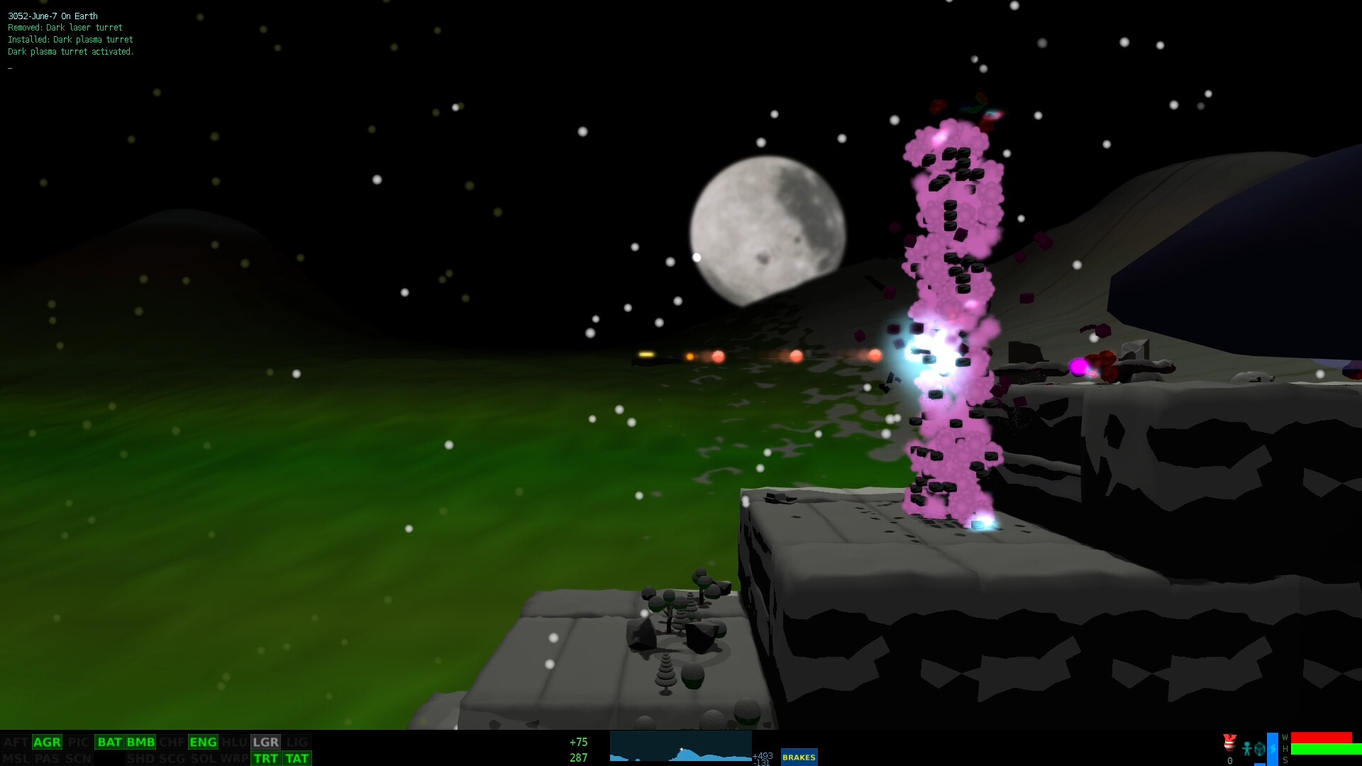 The flying model of the spaceships is simple, arcade style, and while there is varying gravity (depending on planet) its effect to the spaceship can be nullified with one module. The anti-gravity module is immediately available when playing with the easy difficulty mode. Spaceships can be upgraded with modules of different types including weapons, defense systems, and other utilities. Each module has characteristics such as weight and power usage.