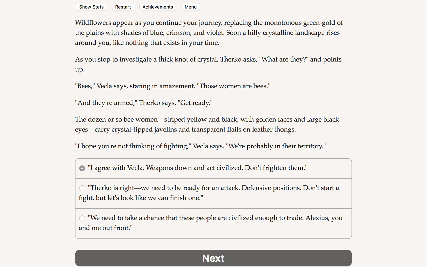 - Befriend, betray, and romance robots, invincible warriors, and bee women from the Crystal Plains.
