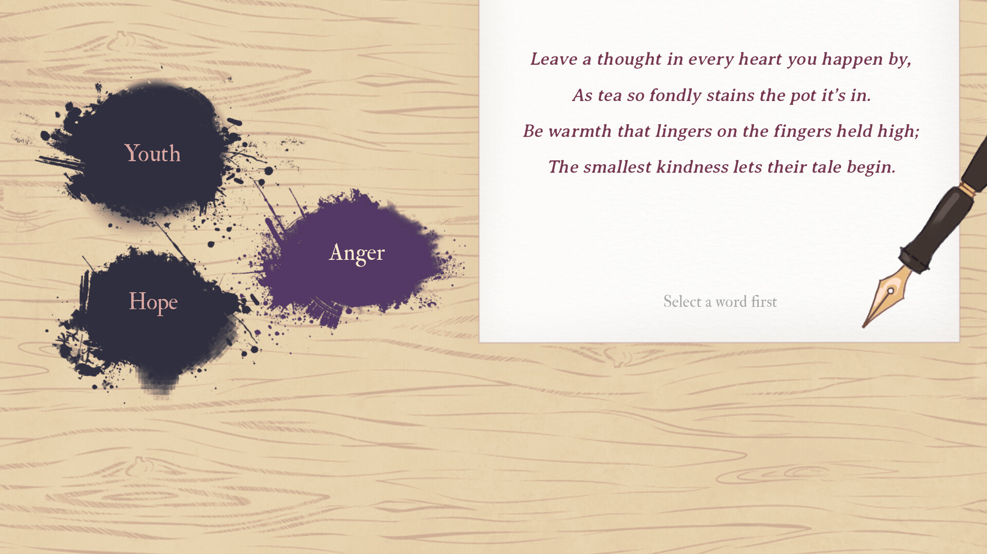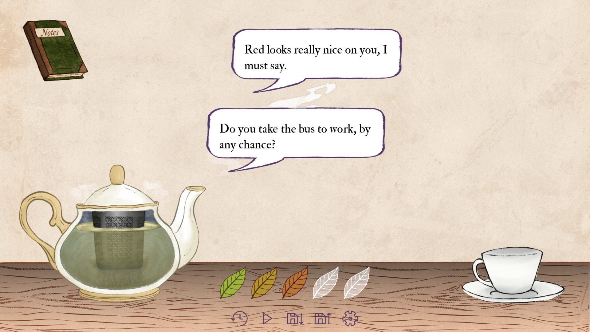Run a tea shop in the British countryside and enkindle your love for poetry in this heartfelt visual novel. Play as Ms Meadows, retired journalist and tea enthusiast, as she prepares for her best friend’s long-awaited visit. Listen to customers’ stories, brew tea, and craft wholehearted poems.
