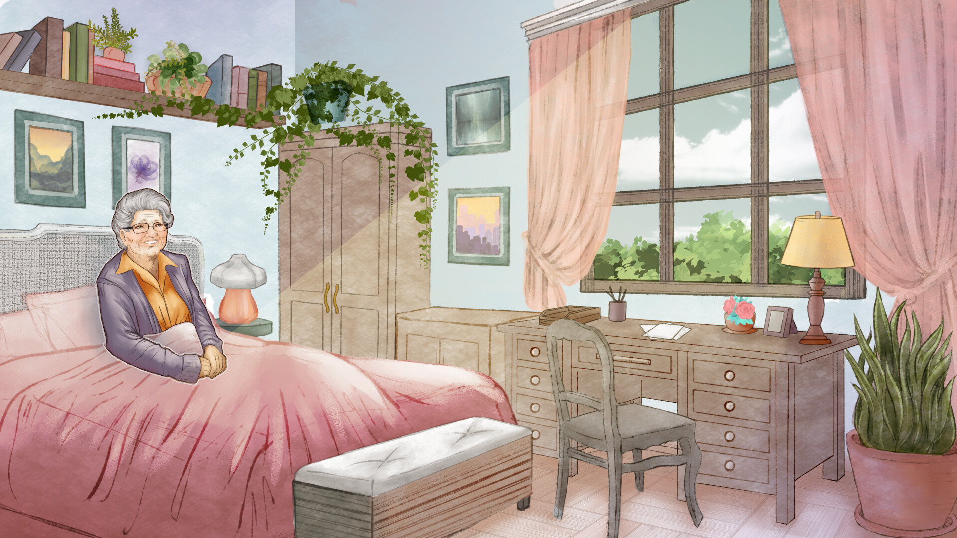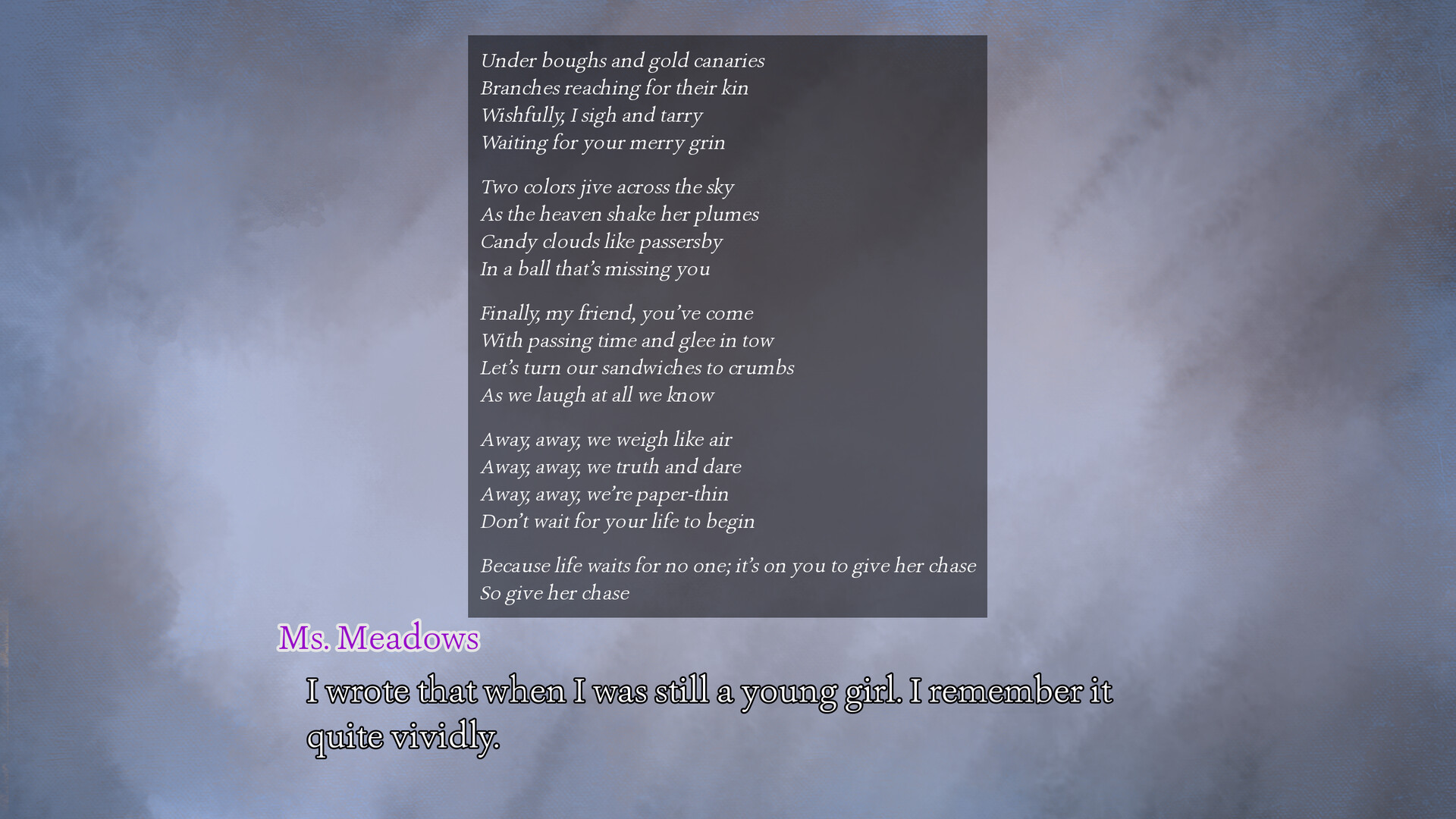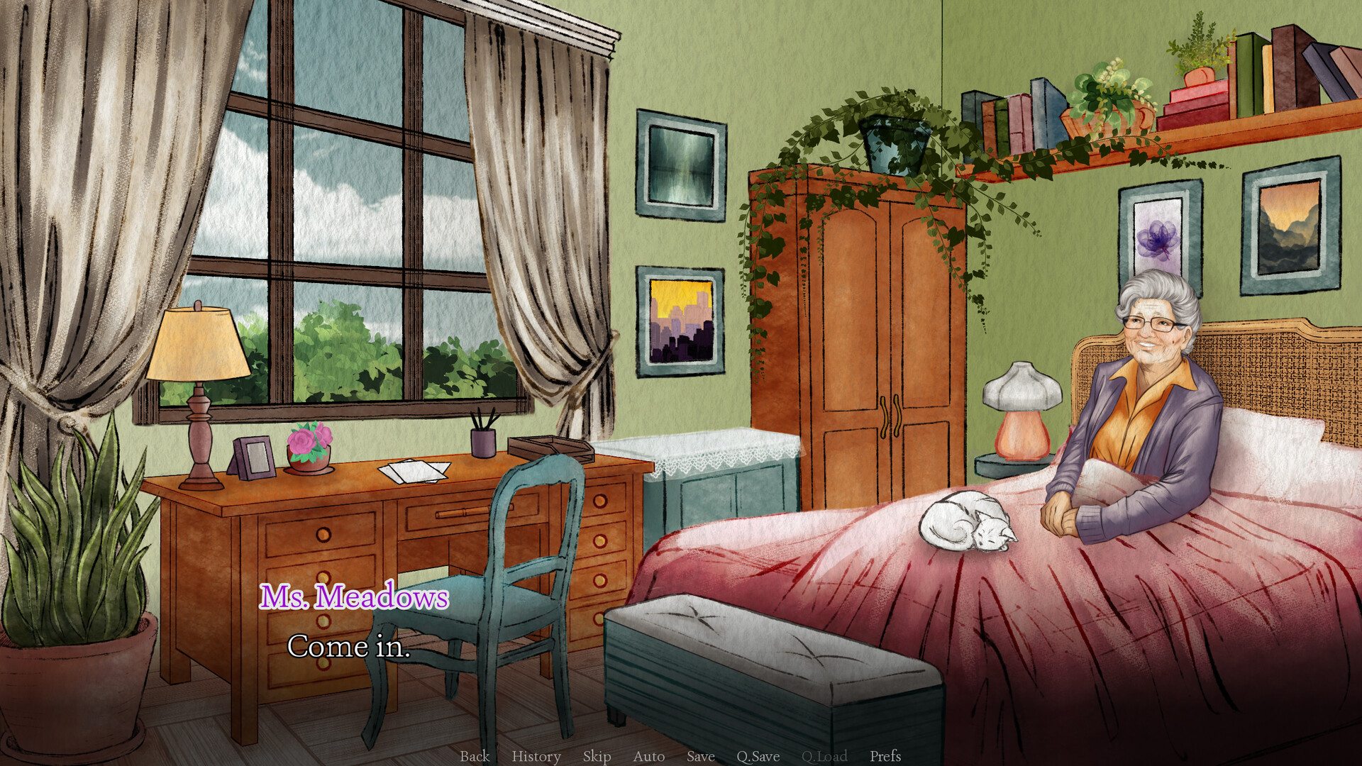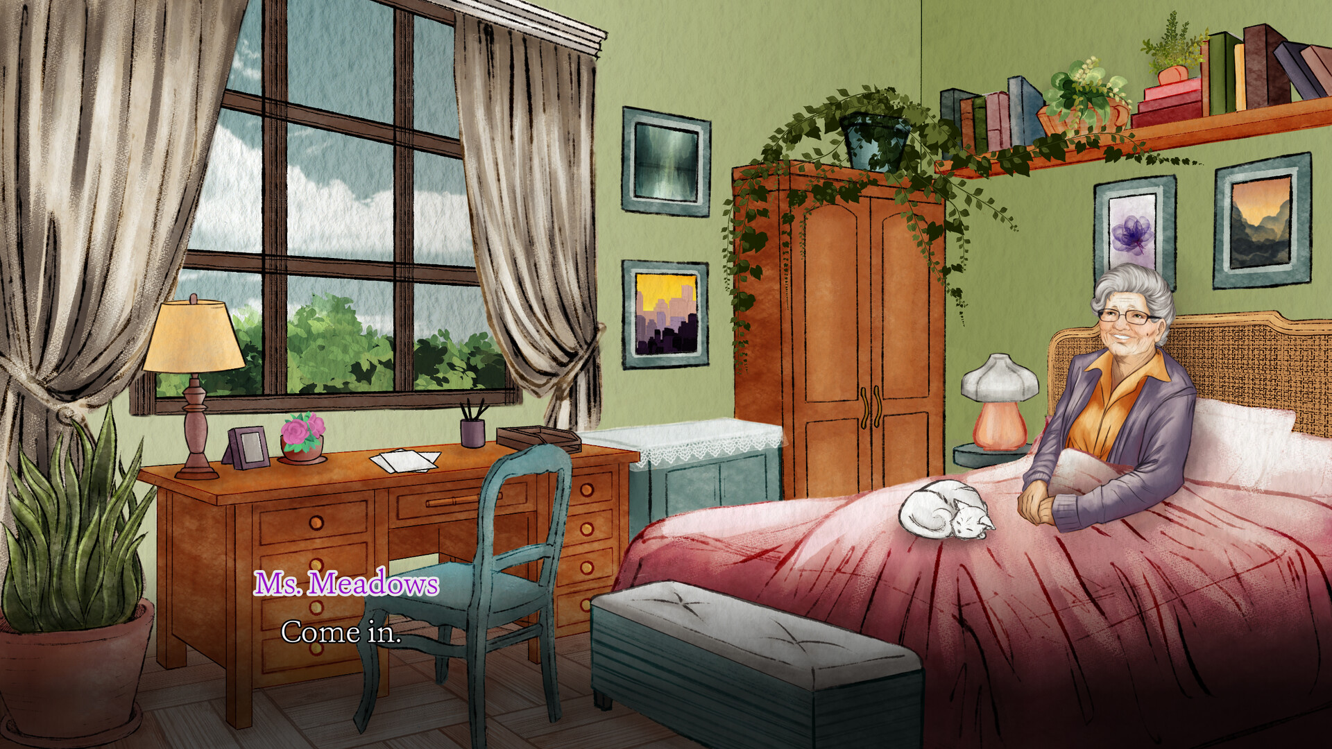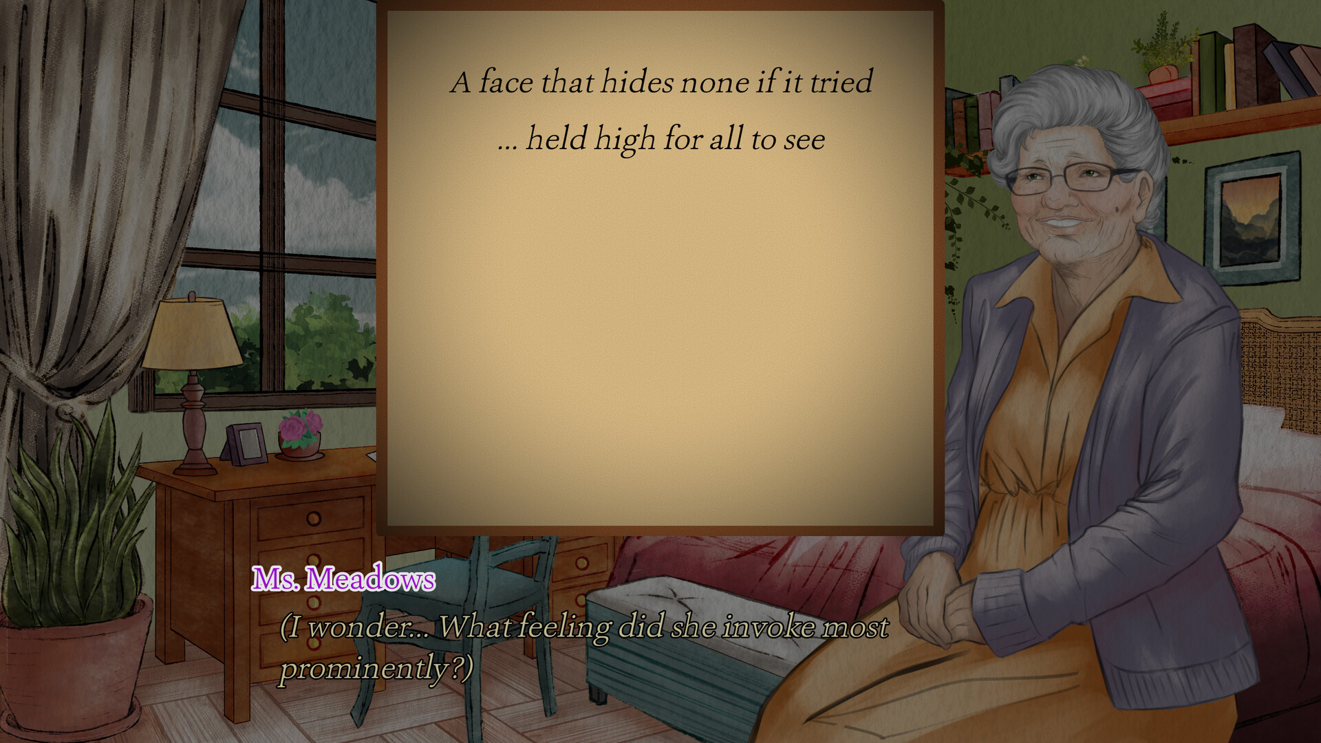 In a quiet English town, Ms. Meadows runs a cozy tea boutique. Once an accomplished journalist, she used her modest savings to open the shop. With no family and a few customers, Ms. Meadows fills her days listening to the stories of those willing to share. Each night, inspired by her encounters at the tea shop, Ms. Meadows writes her latest poem, after the nurse arrives to administer her medication.