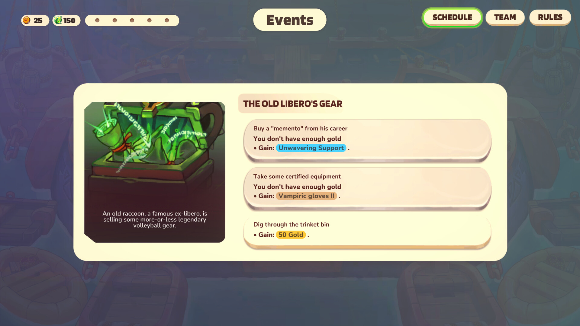 Between matches, take care of your team and make the right decisions to ensure your victory. Each day between matches lets you upgrade your players, gain objects and face unexpected events. Your decisions will have a direct impact on your tournament progress.