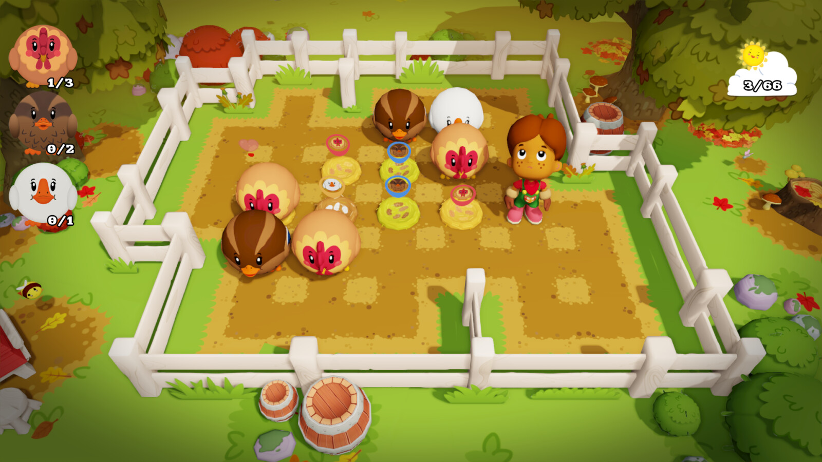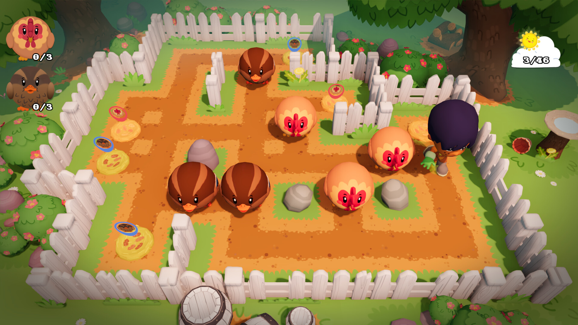Rolling each lost bird to its correct type of nest completes the day, but watch out, the Rooster will be watching your every move, take too many and he may fail you! Luckily, he lets you in on a little secret early into your SokoFarming career allowing you to undo moves to correct your mistakes!