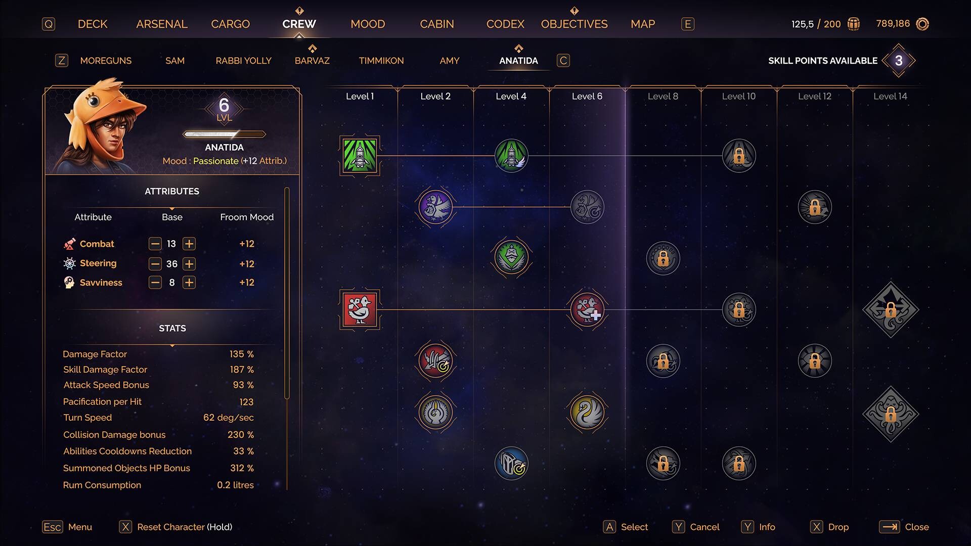 The ship you control has operation modules - steering, weaponry, drone, mast, and deck - which must be manned by crew members. Each crew member has their own skill tree, with specialized abilities for each module. You can train and assign your crew members to specific modules, which impacts your arsenal of active and passive abilities. This allows you to experiment with different crew layouts and combat styles.
