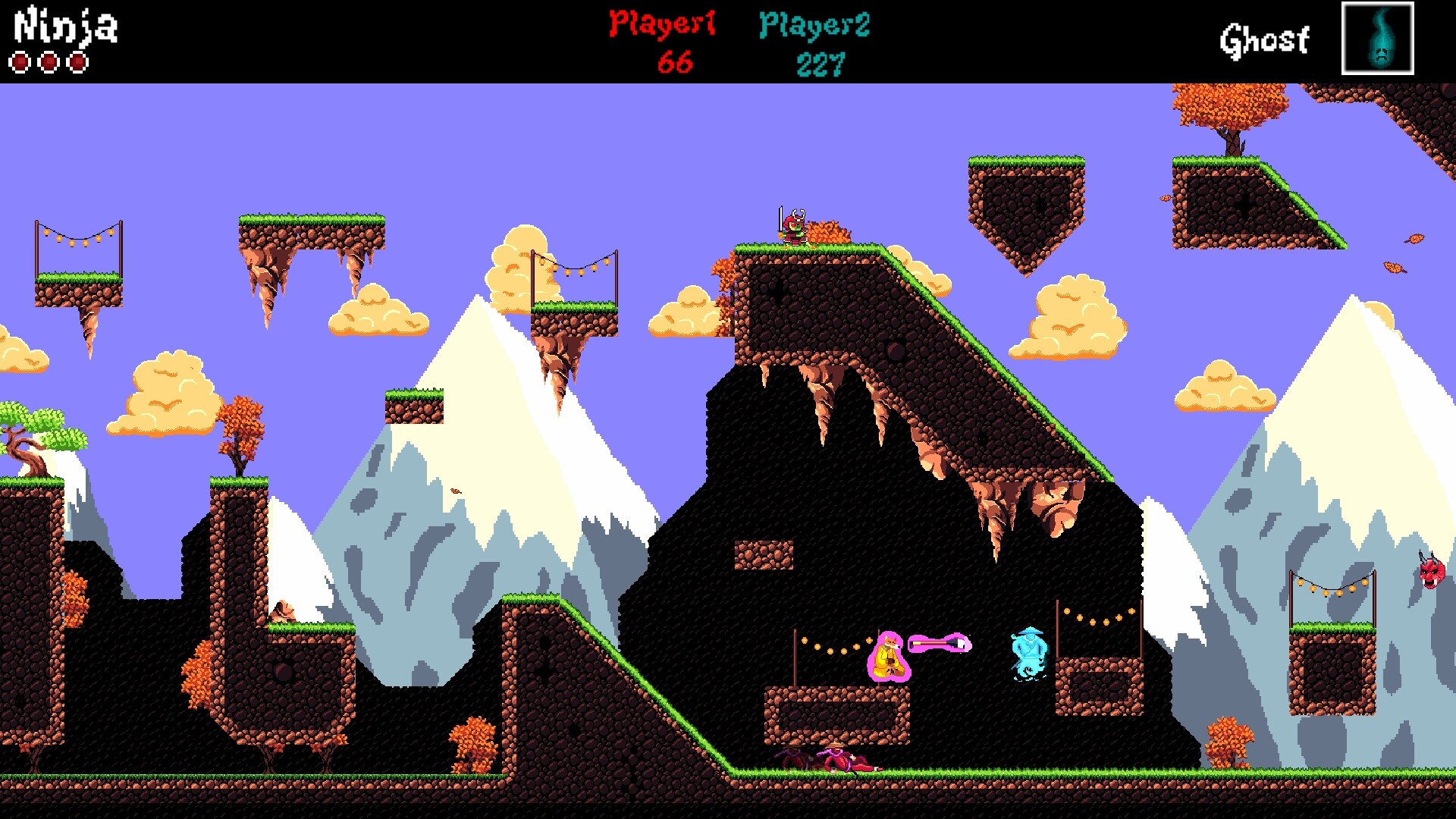 One player controls the agile ninja, navigating treacherous terrain, while the other becomes a ghost, possessing enemies to thwart the ninja's progress.
