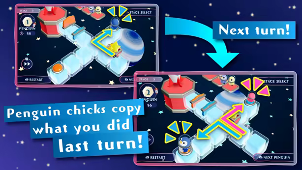 Guide the minecart of stars to the rocket by working with the penguin chicks who will mimic your actions!