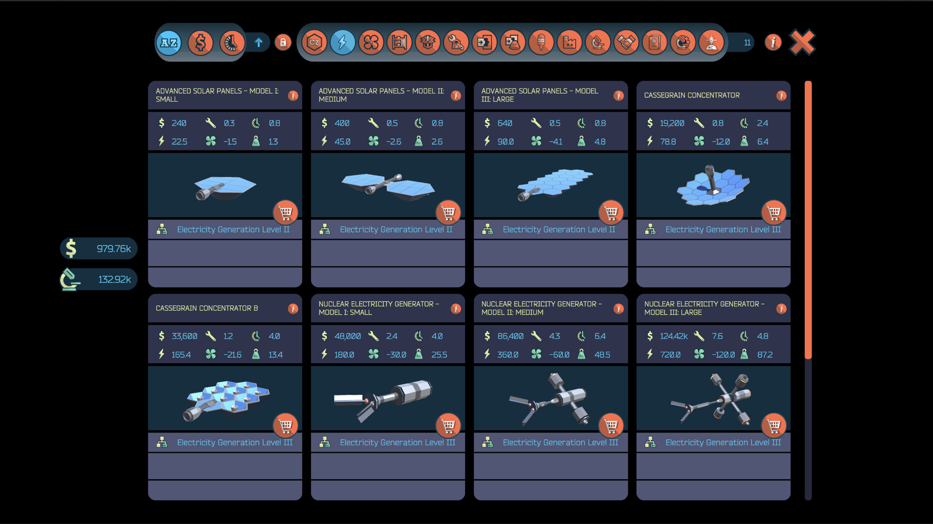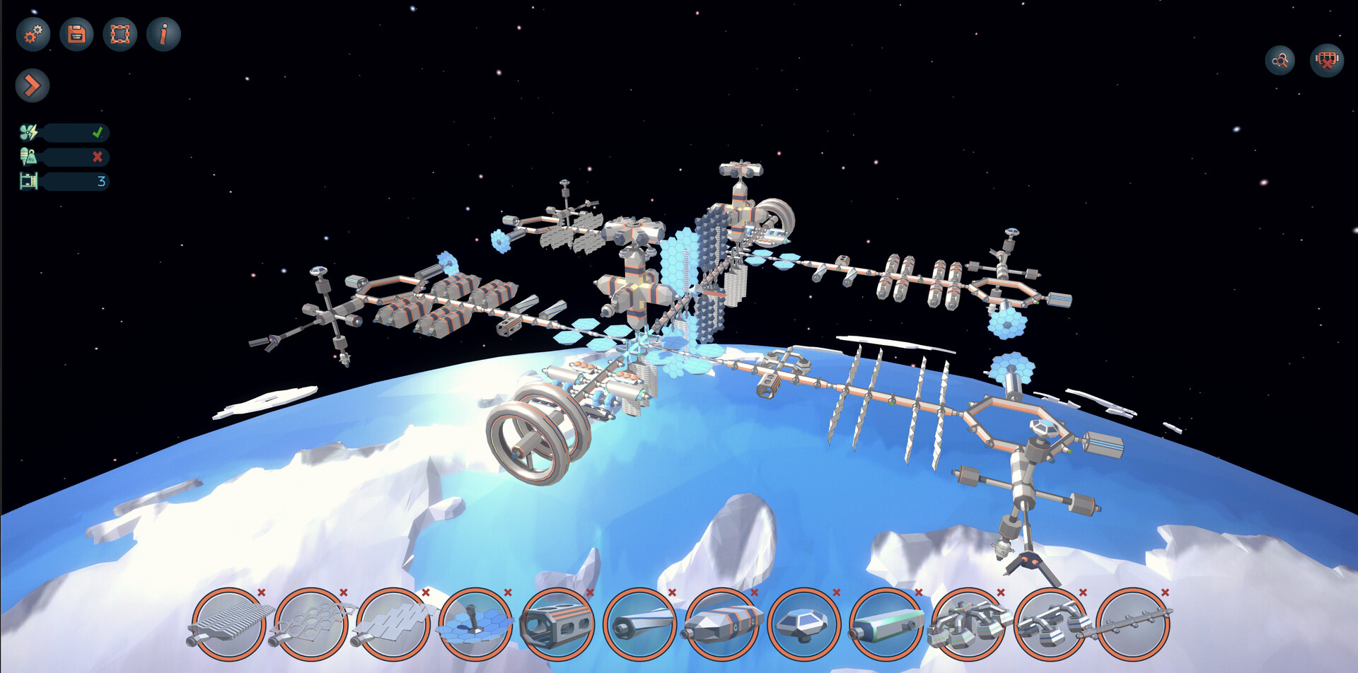 Purchase and install modules across a wide range of categories (electricity, cooling, structural, space tourism, research, manufacturing, Command & Control, etc).