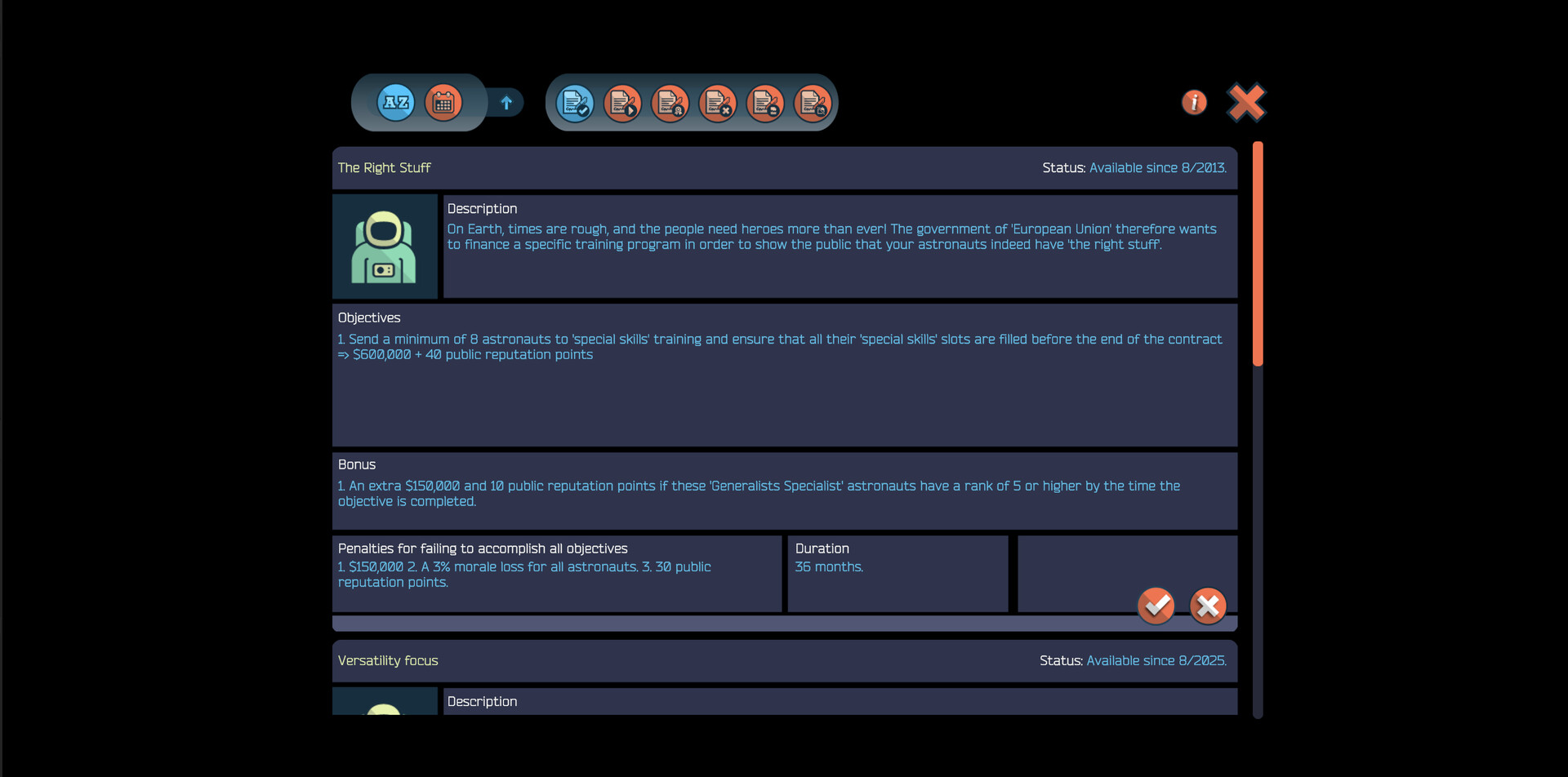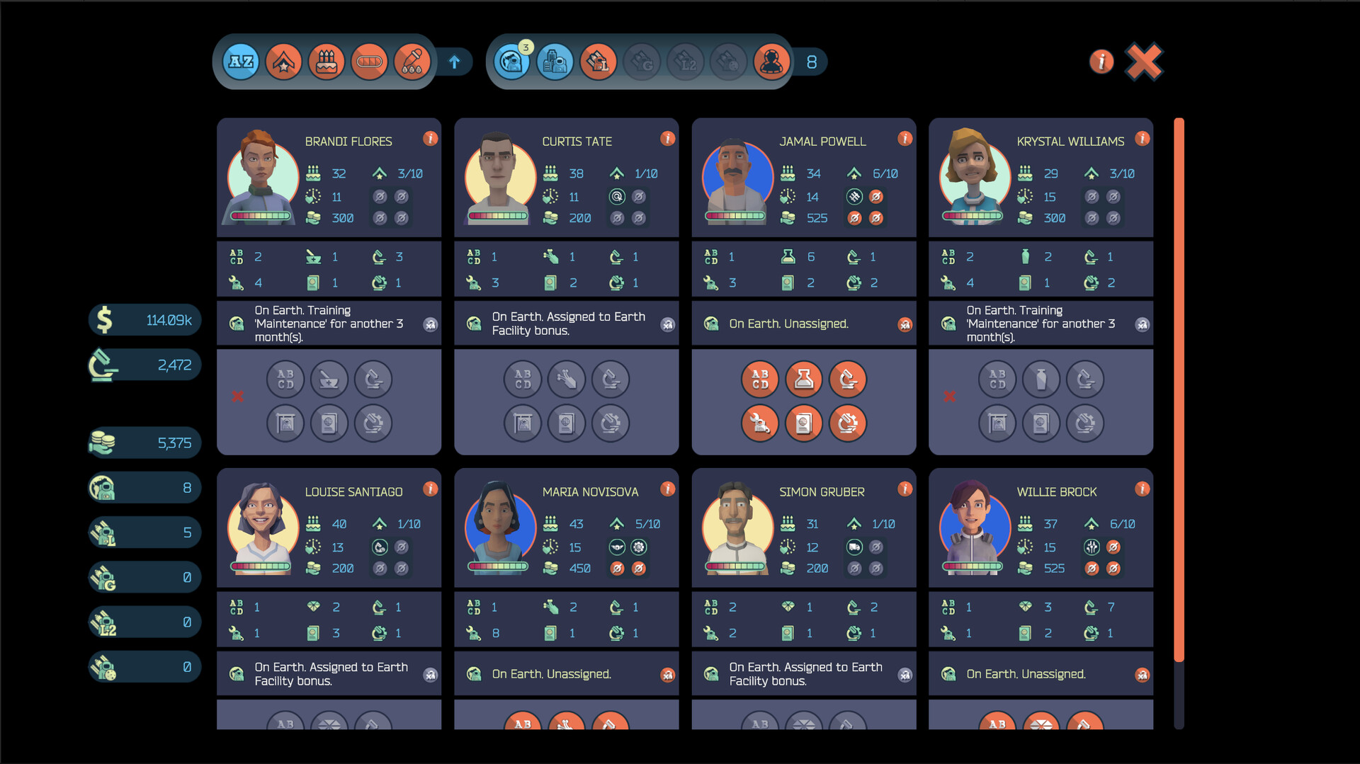 Manage the members of your astronaut corps, whose individual morale ratings are affected by the assignments they get and other external events.