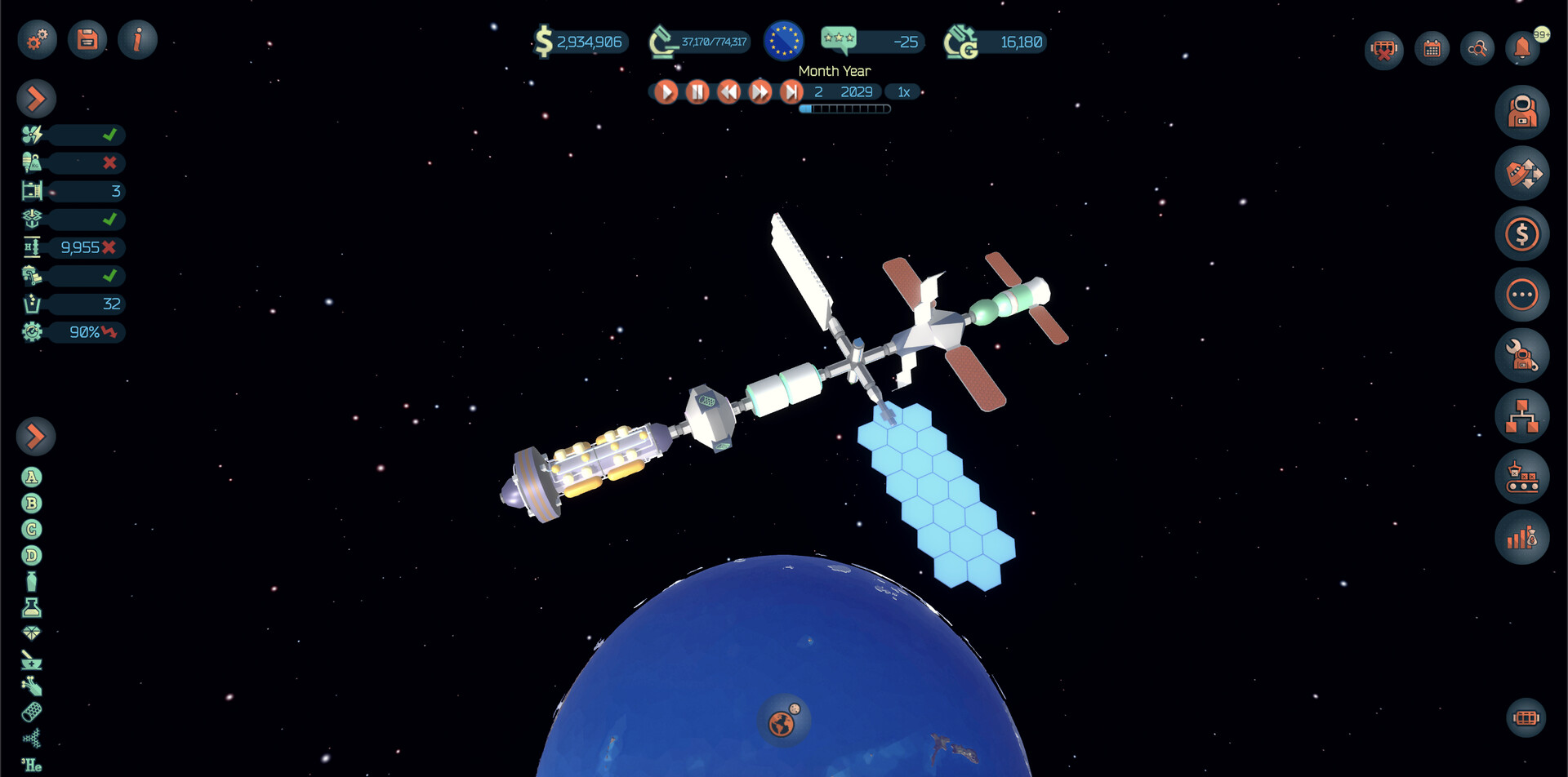 After selecting a partner government, choose between three initial configurations of the Core Module, launch it into Low Earth Orbit (LEO), and begin your journey. A typical month as the CEO of this venture will find you ordering modules, arranging resupply spacecraft, training astronauts, acquiring technologies from a vast tech tree, and manufacturing commercial goods that can later be sold in a dynamic market.