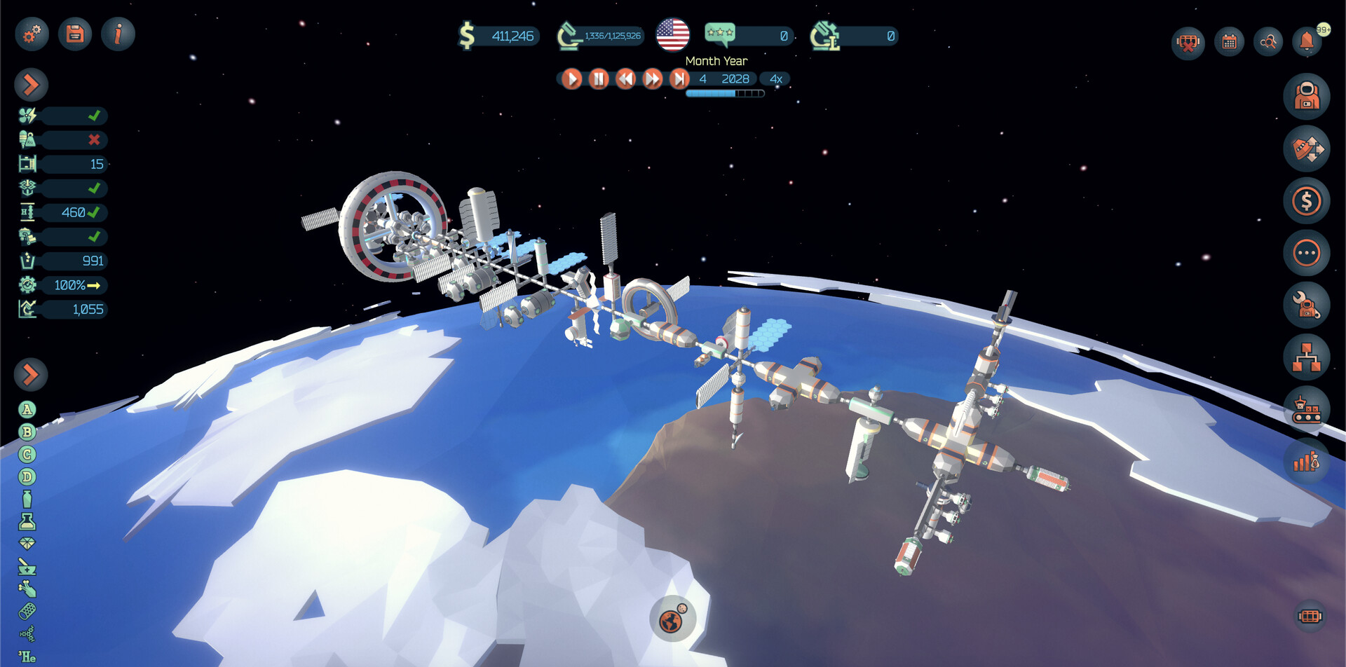 Space Station Designer is a construction and management game where you are in charge of building and expanding a network of orbital outposts in Earth and Lunar Orbit with the ultimate goal of building an ambitious megaproject: a 'Lunar Space Elevator'.