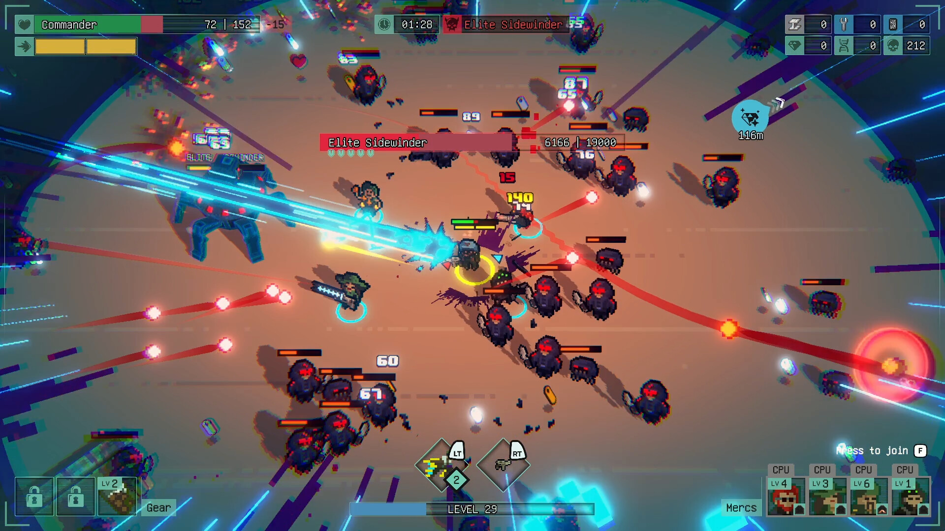 Lead your squad of Mercs against M.E.G.A. Corp.'s evil robot army. Fast-paced twin-stick action, frantic horde survival, tactical squad-building & lots of loot! Exploit game-breaking synergies and beat the evil billionaire bosses in ever-changing operations. Lock, load, and loot, Commander!