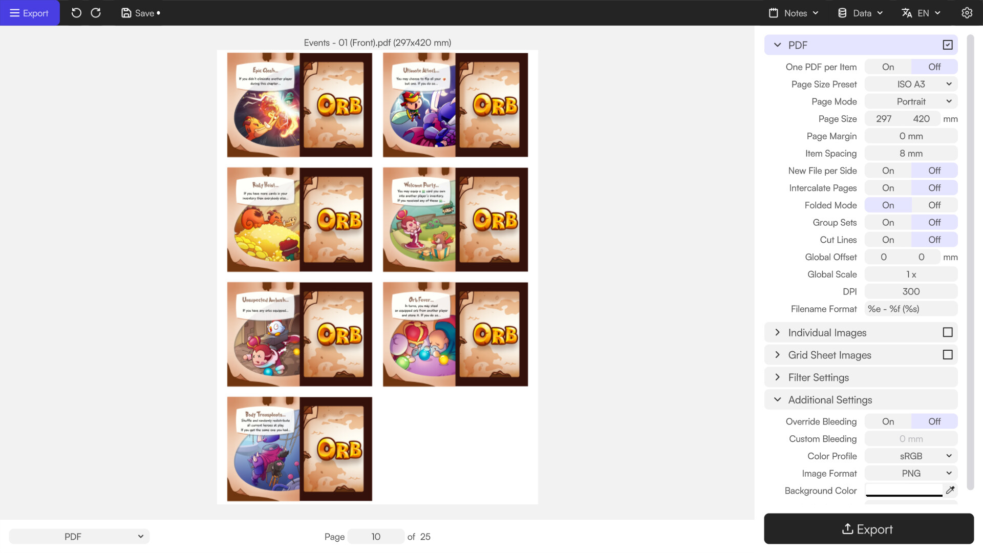 - Print and Play...: Get a printable PDF with proper bleeding, cut marks, foldable PnP, in any color format or paper size you want with just a click.