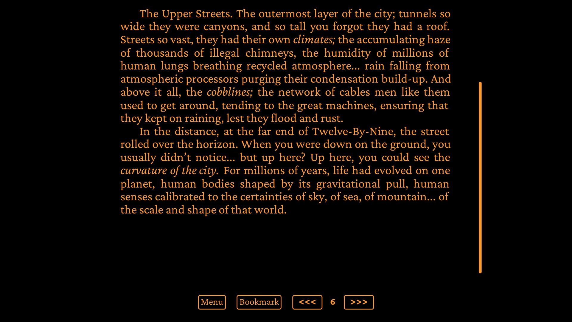 In this collection of mystery, misadventure, romance and horror, workmen swoop along cables high above a teeming city, praying they don’t plummet to their doom, while below them, a young seamstress sees too much and finds herself threatened by the sordid side of city politics. In the shadows of the deeper streets, an ill-fated academic studies a mysterious artefact, a detective investigates a kidnapping, and farmers tending fields of vat-grown flesh contend with the arrival of bodies in their meaty crop.