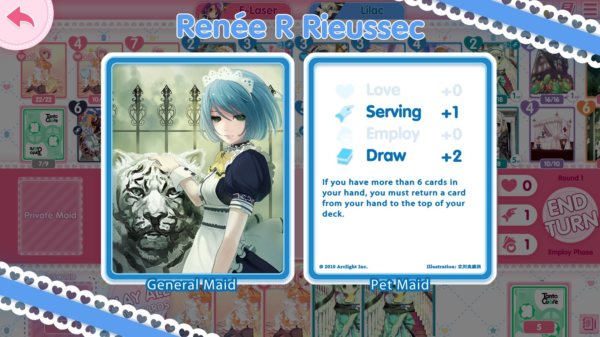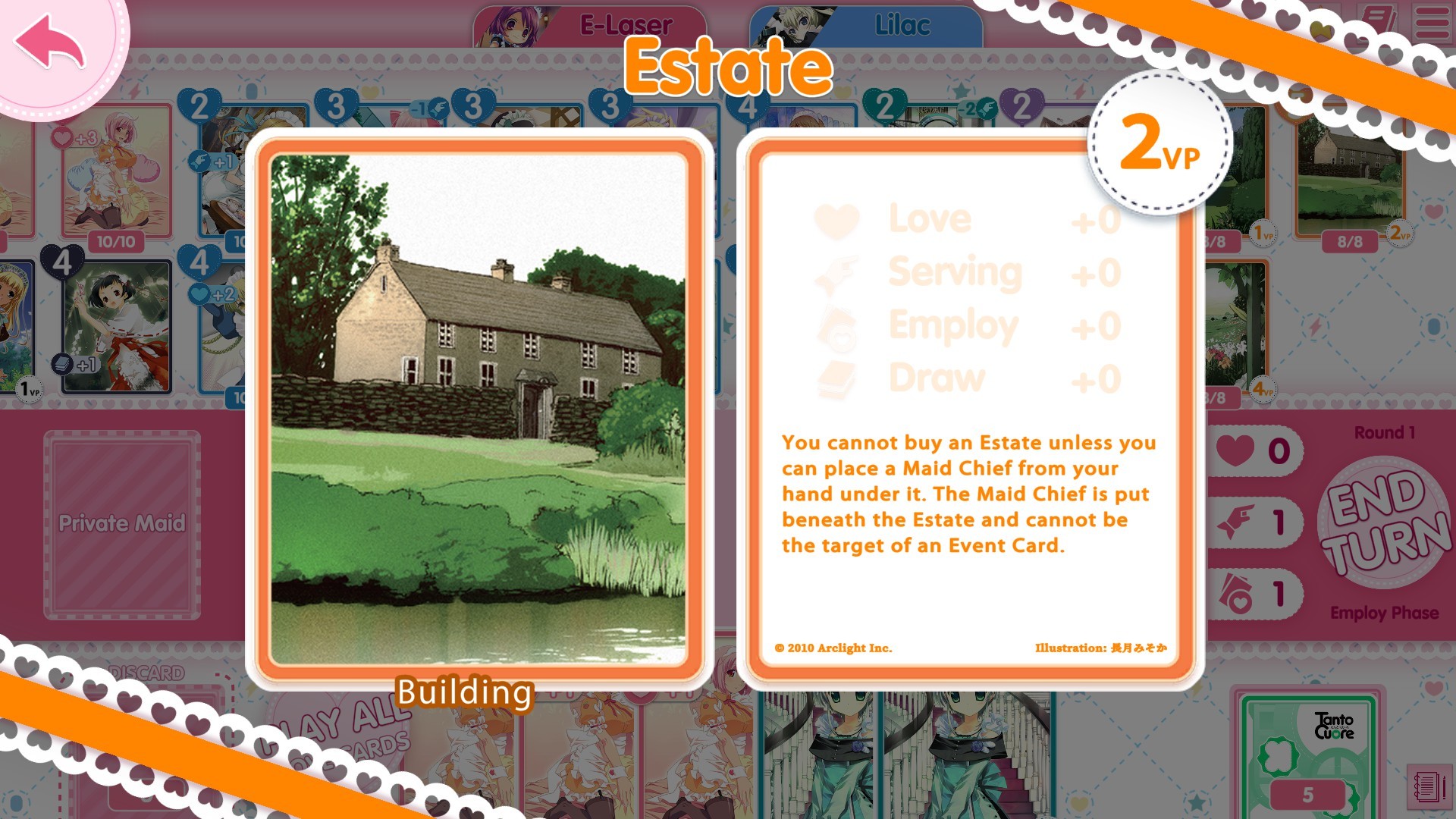Each player plays as the Lord of a mansion and hires maids to fill out their house to become the King of Maids! The end goal is simple enough, the player who has the most Victory Points at the end of the game wins! Players acquire Victory Points by employing a variety of maids and "Love" cards that allow for different strategies. You can even employ Private Maids that stick around to use their special powers each per turn! Some give you a bonus, or affect your opponents in a negative way. But beware, your opponents can make your maids sick or give them bad habits, affecting your maids in negative ways and decreasing your Victory Points!