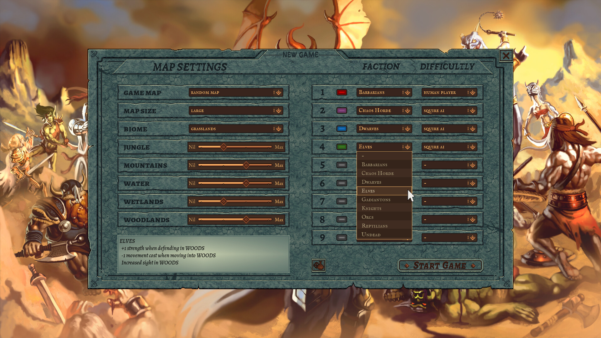 Every game is a new challenge with randomly generated maps rich in varied terrains. Learn to adapt your strategies to the lay of the land, whether it's the soaring mountains favored by Dwarves or the creeping marshlands that empower the Undead.