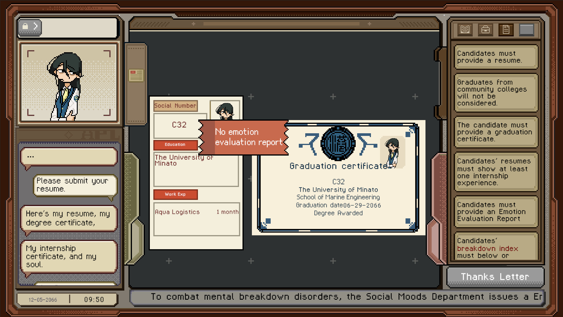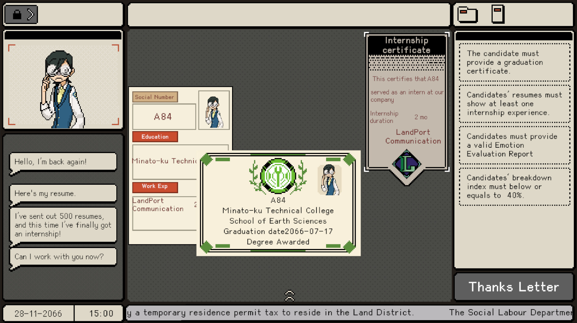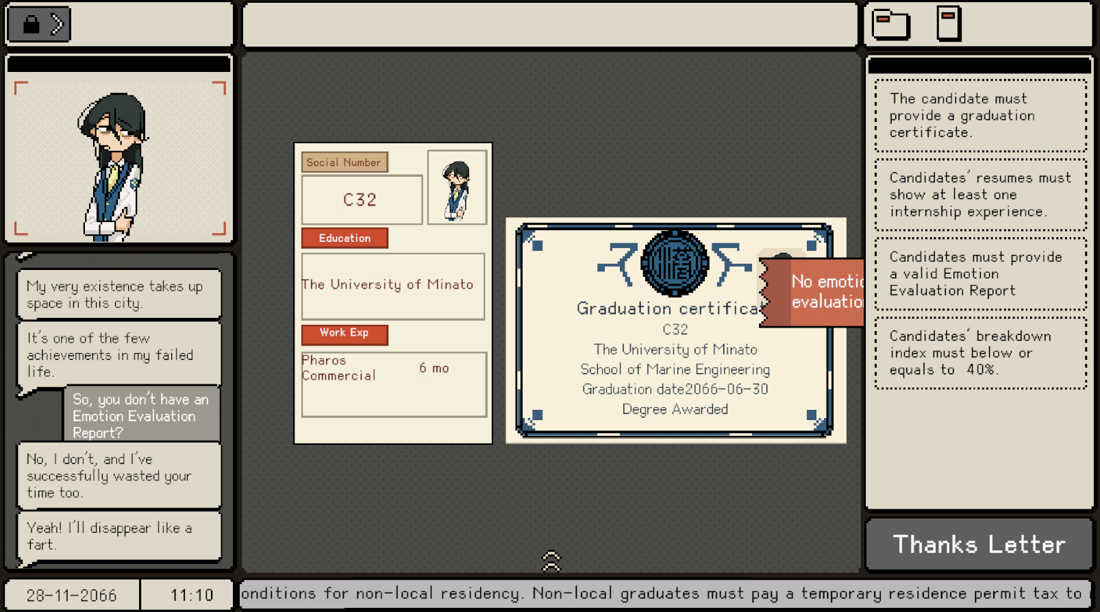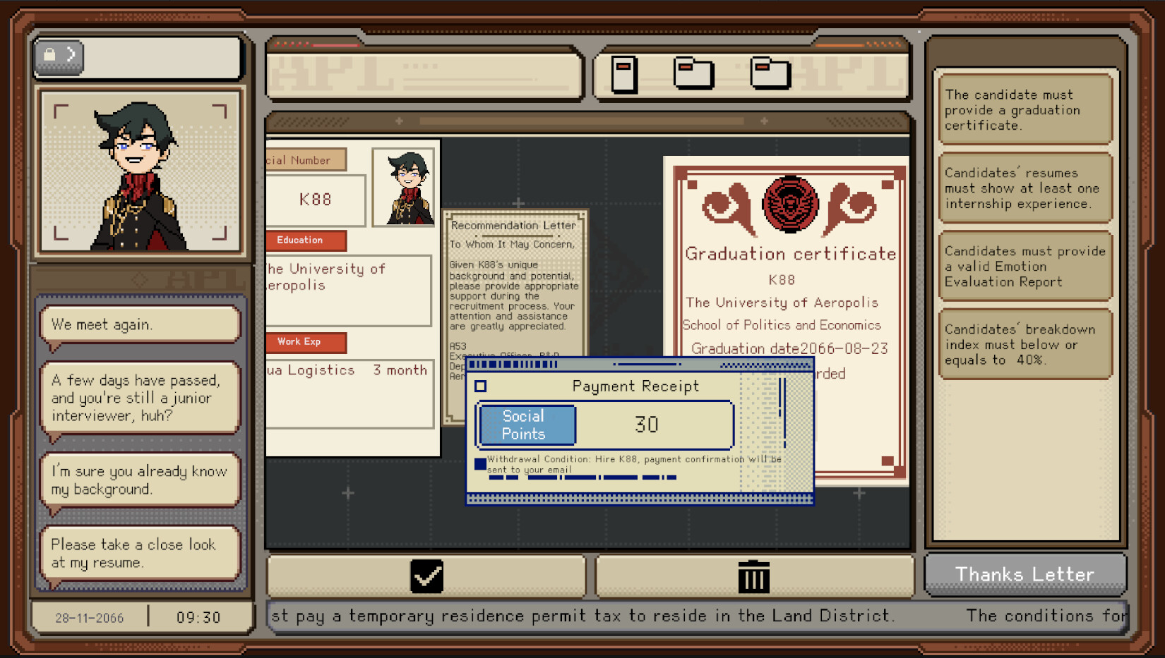 Thank You for Your Application is a narrative-driven interview simulation game. You play as a fresh graduate who has the rare chance to join the largest company in Aeropolis as an interviewer. You’ll screen resumes and issue thank letters for various reasons.