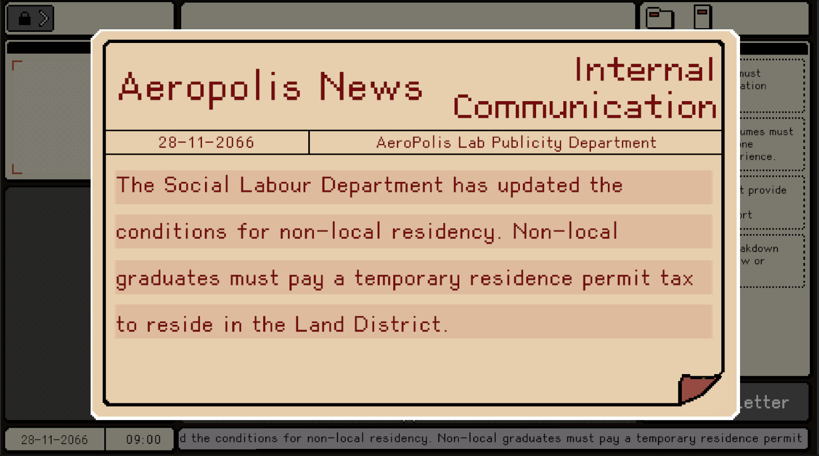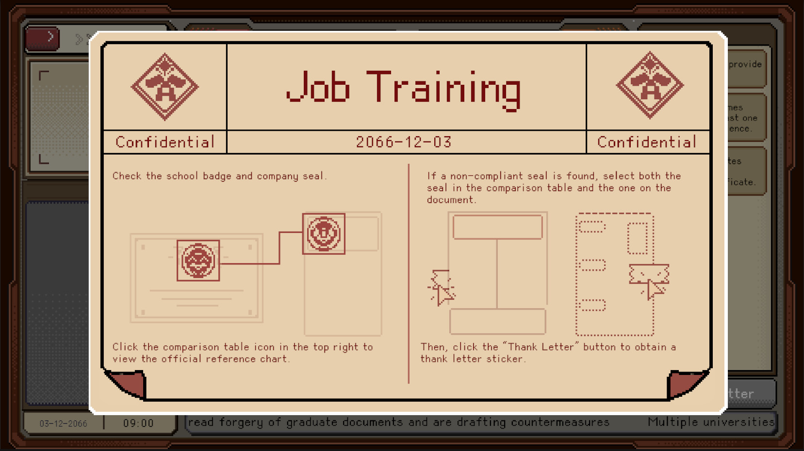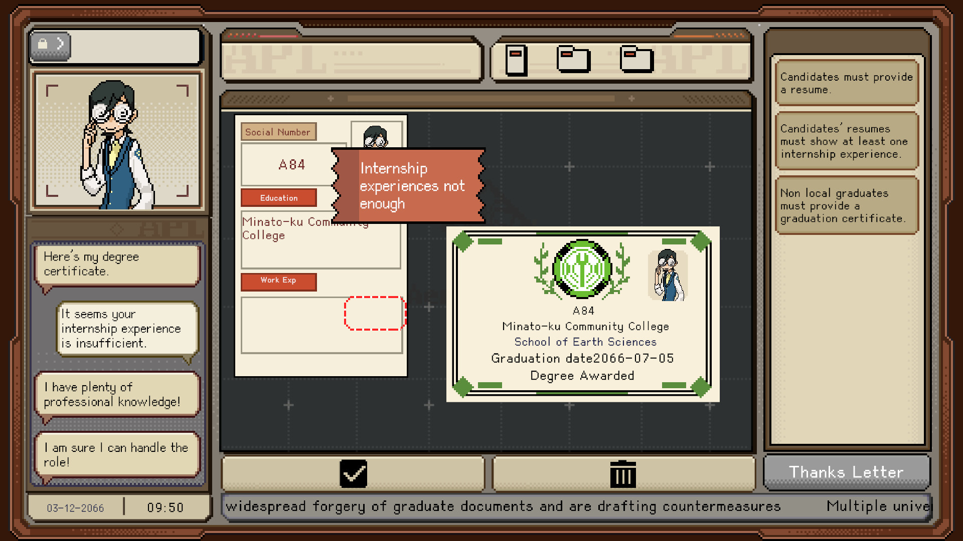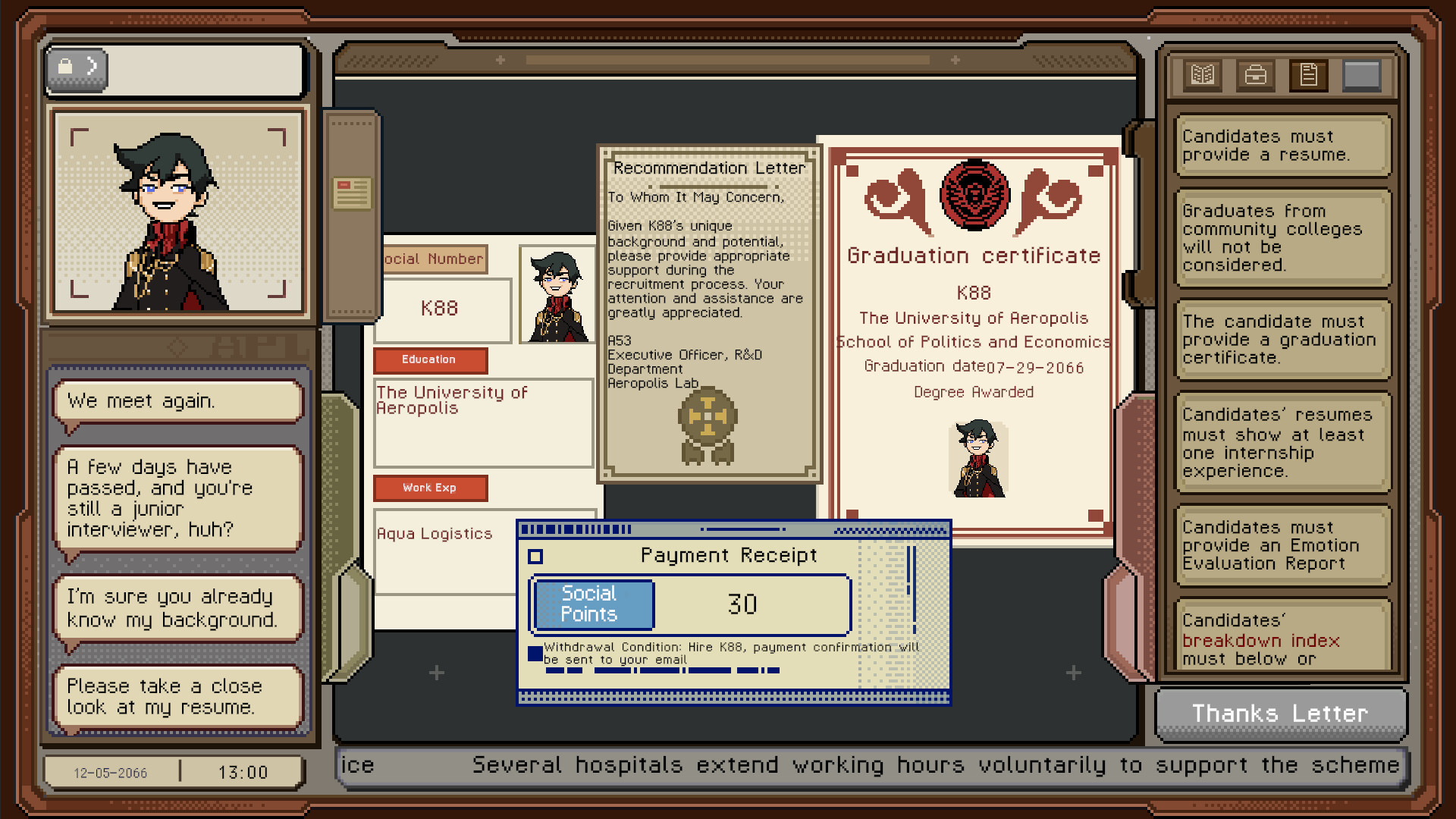 Thank You for Your Application is a narrative-driven interview simulation game. You play as a fresh graduate who has the rare chance to join the largest company in Aeropolis as an interviewer. You’ll screen resumes and issue thank letters for various reasons.