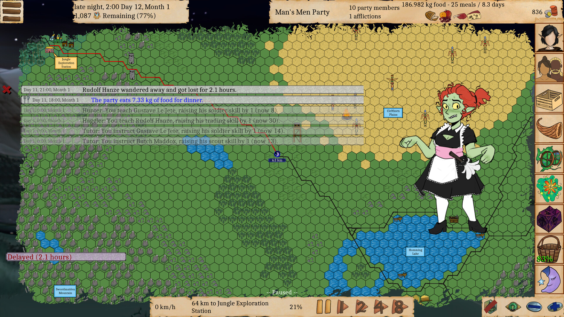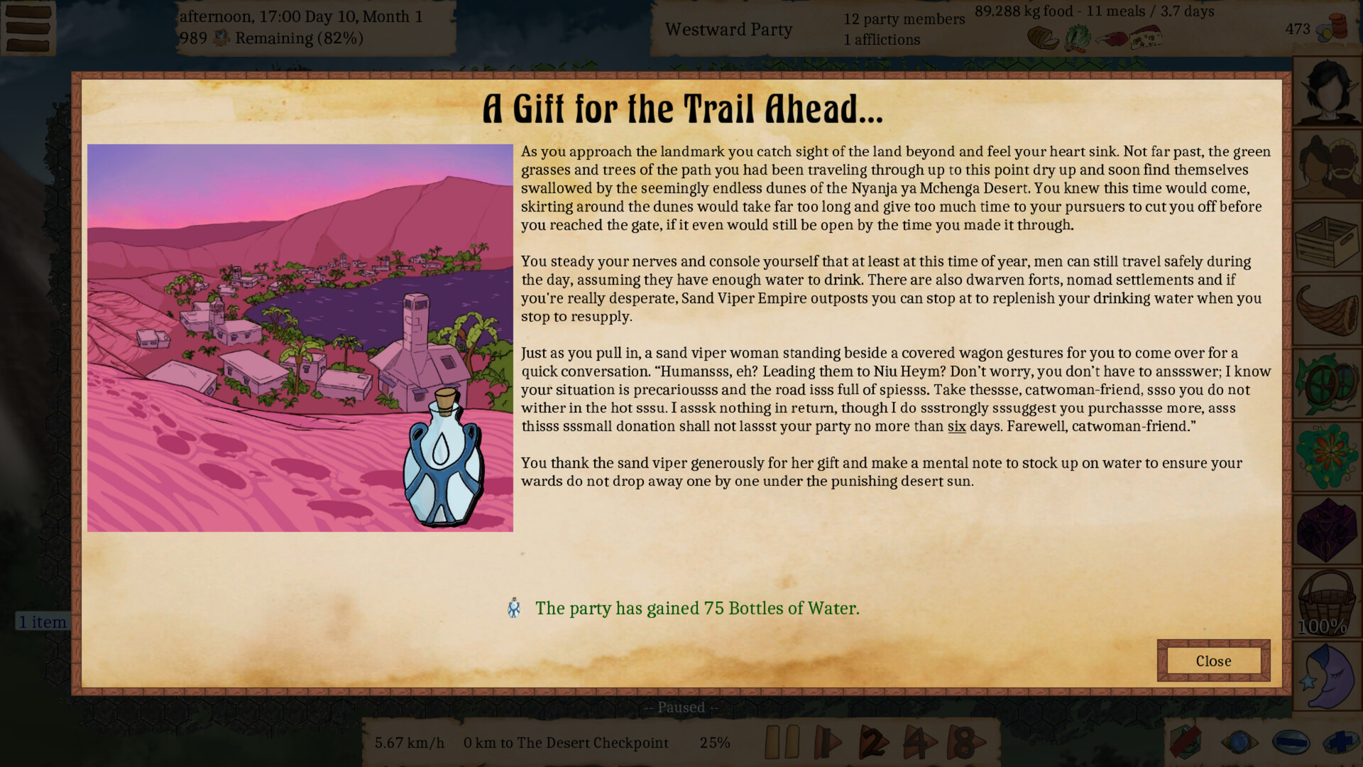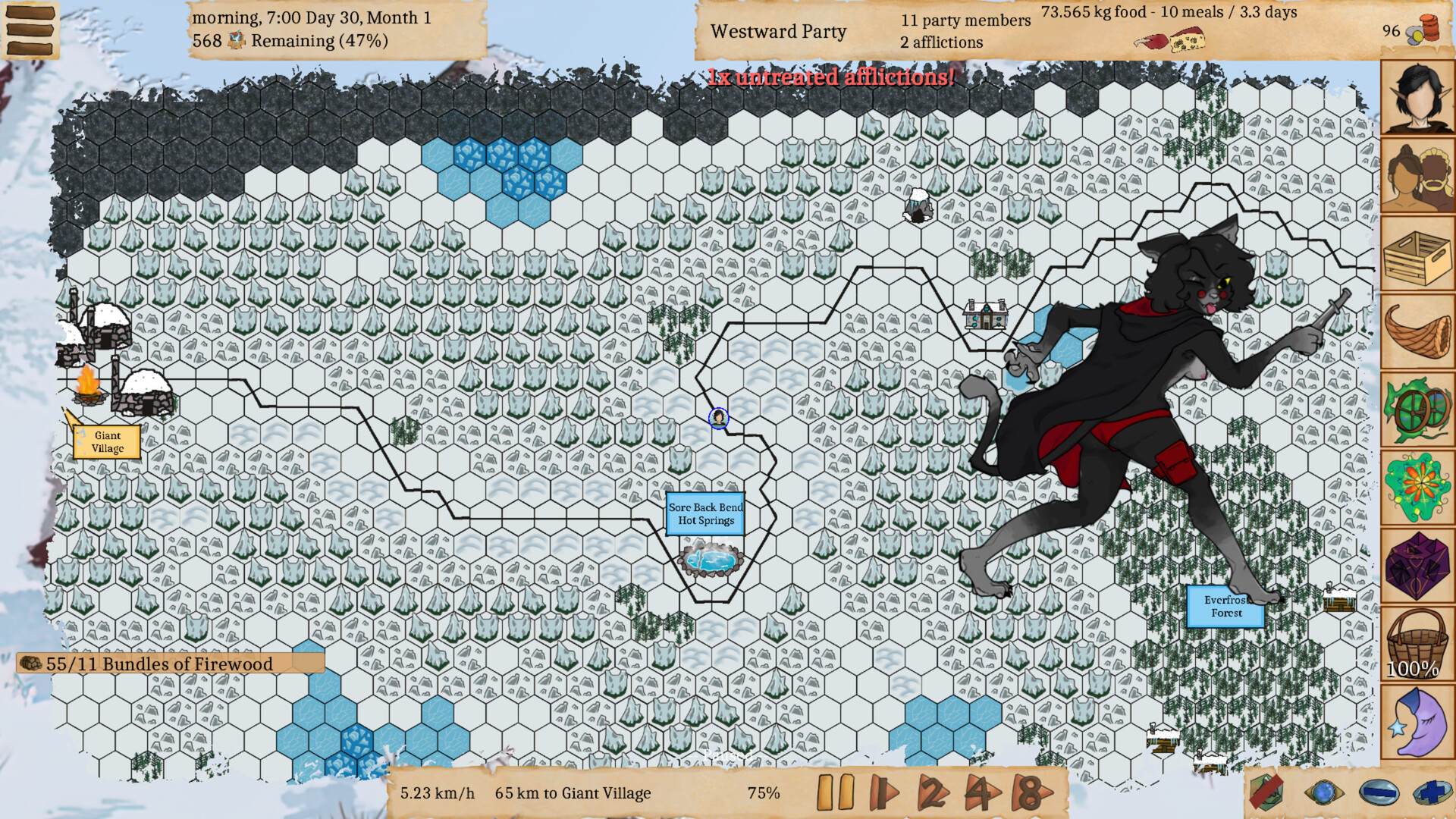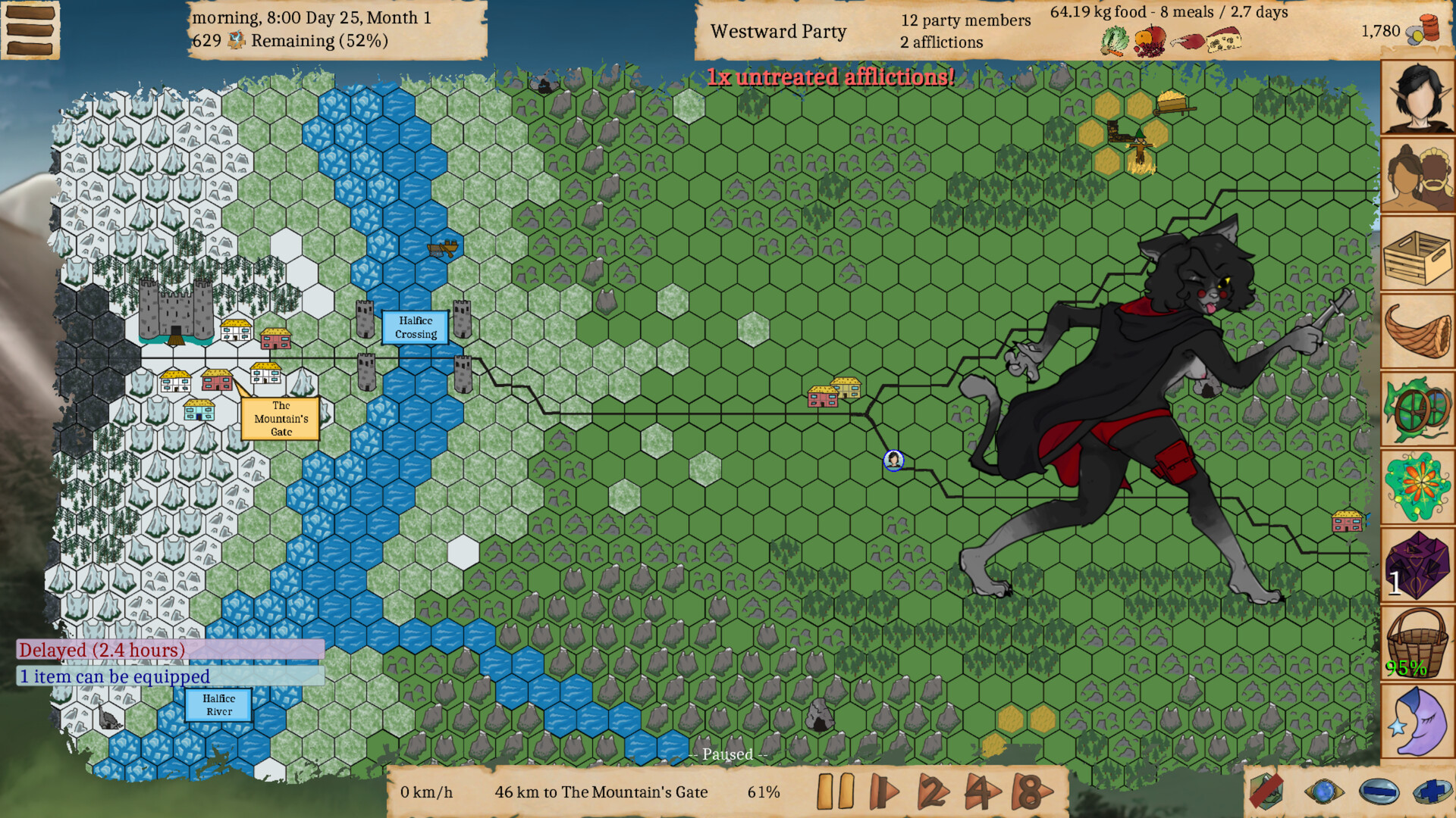 Cursed artifacts! These are very valuable items worth a lot of money to certain merchants, but keeping them with them presents its own sets of ever-growing risks! Will you risk it? World map! See the continent of Aphrodisia with 18 hexagon-tile maps spanning the complete journey from east to west. Player perks! Select up to three player perks to gather more food along the trail, gain the favor of the gods and goddesses, augment party members' skills, increase the amount of food your livestock produce, and more.
