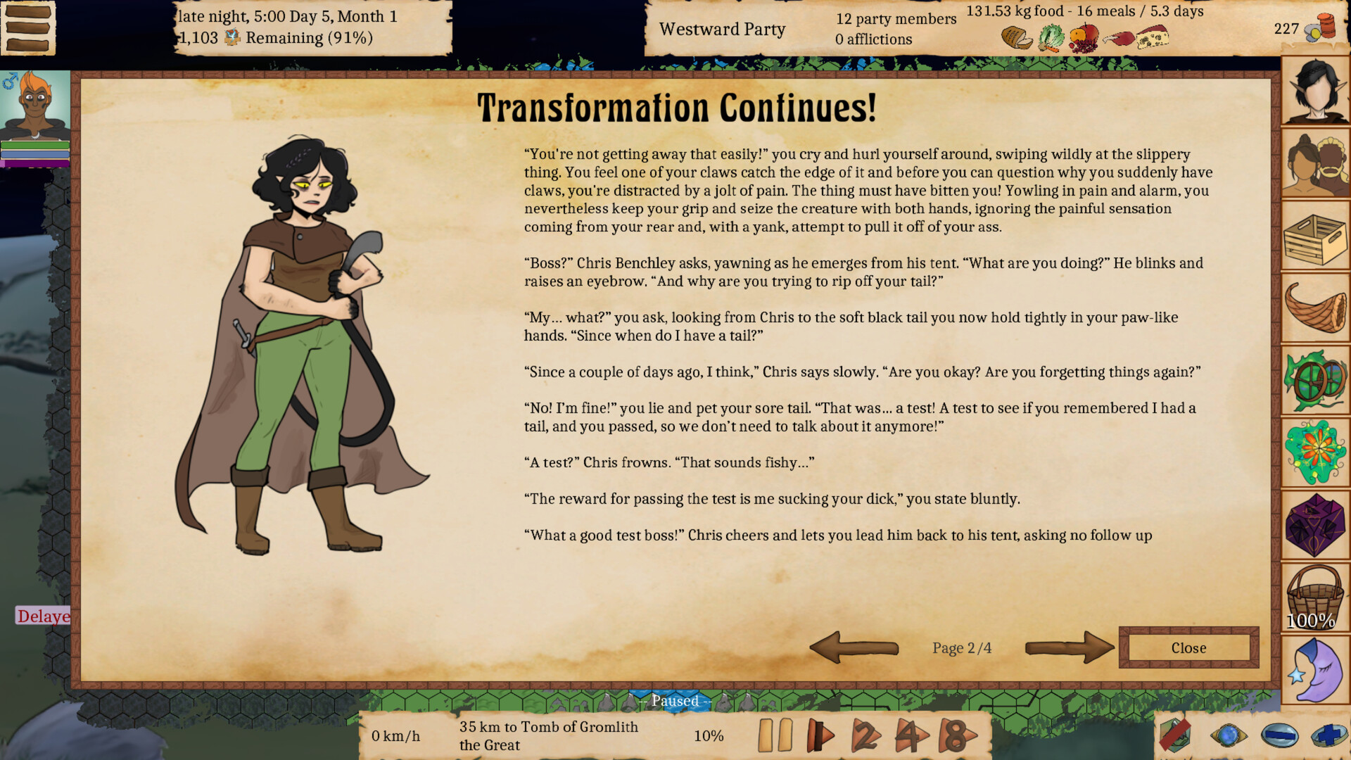 - 230+ choose-your-own-adventure-style encounters where party members can be transformed into elves, wildmen, animals, monsters, statues, clothes, fairies, dinosaurs, and much, much more - 90+ afflictions, slow transformations that stay with party members, transforming them a little more bit by bit - 25+ Fully illustrated player character transformations, complete with Instincts Kick-In events - Unique epilogues for a victorious campaign, failures due to running out of rift charges, and failure due to losing all party members - Two reworked player transformations, the manly dwarf and succubus sequences, which now trigger directly from the female starting elf form - Party member customization: put yourself and your friends into the game and see what fate has in store for you, or if you'll be one of the lucky few to reach Niu Heym in your original body - Hundreds of illustrations for encounters and afflictions by BeingObscene, Wrenzephyr, Unidentified-TF, Vjeol, Balile, Luxianne, AcuteGabby, and other talented transformation artists.