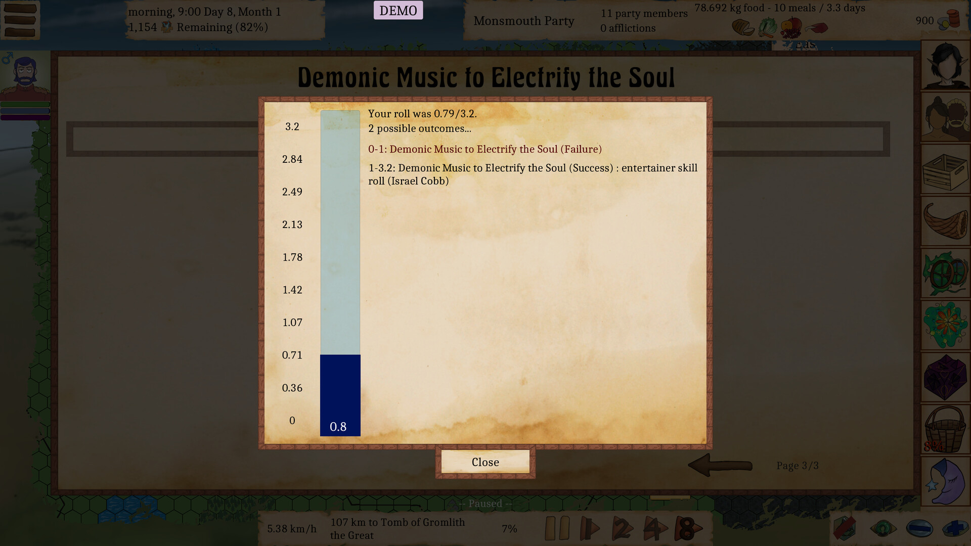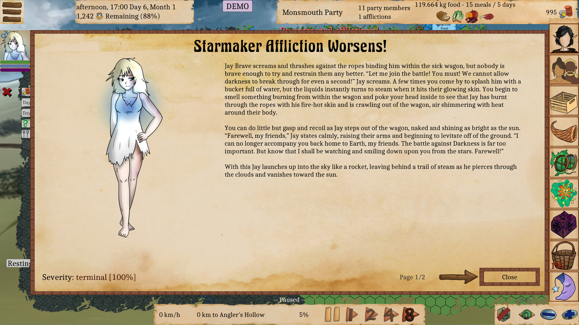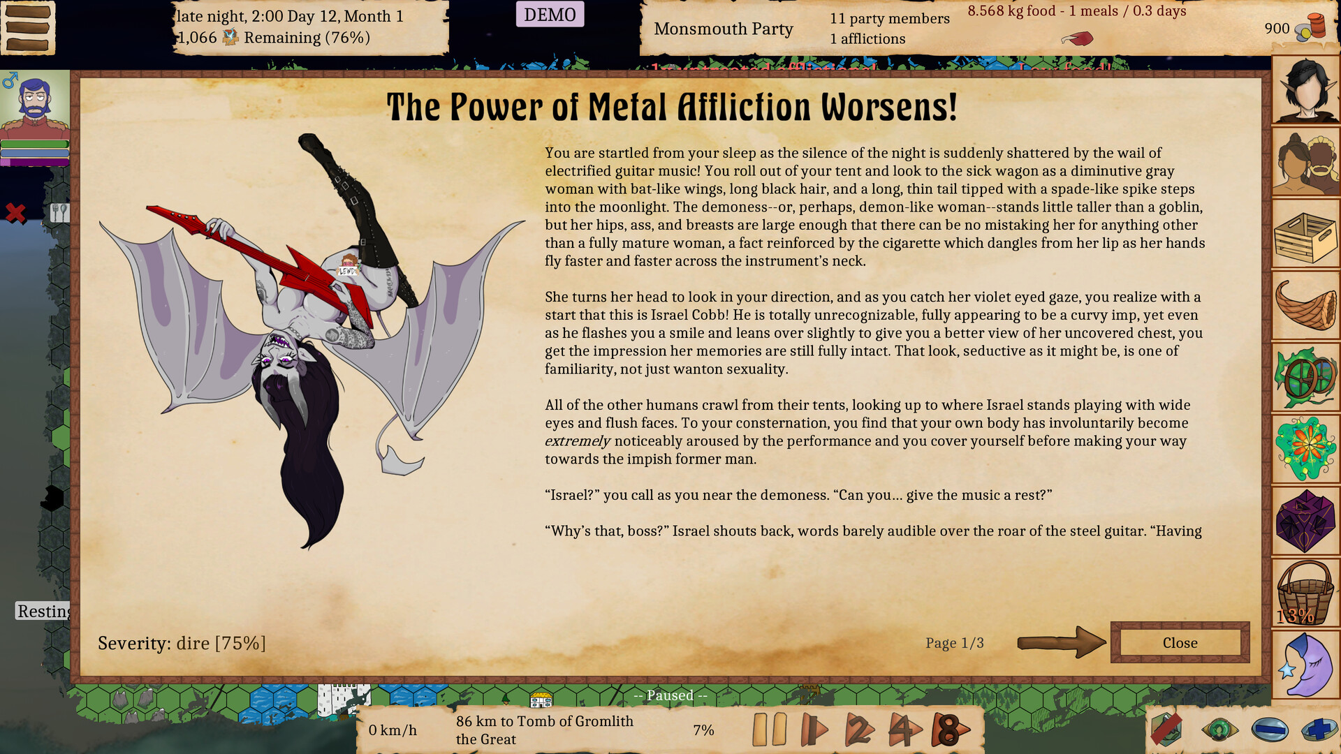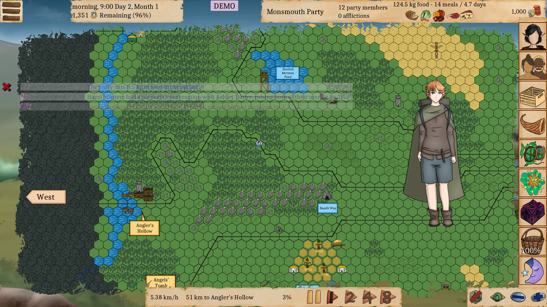 Cursed artifacts! These are very valuable items worth a lot of money to certain merchants, but keeping them with them presents its own sets of ever-growing risks! Will you risk it? World map! See the continent of Aphrodisia with 18 hexagon-tile maps spanning the complete journey from east to west. Demo has 1 out of 5. Player perks! Select up to three player perks to gather more food along the trail, gain the favor of the gods and goddesses, augment party members' skills, increase the amount of food your livestock produce, and more.