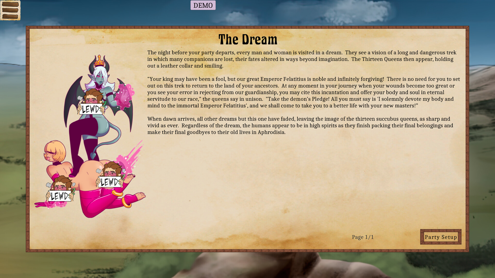 [18+] Guide the last of humanity across the vast, magical, danger-filled island of Aphrodisia to Niu Heym, the City of the Gate, before demons enslave them... but only if you can keep them--and yourself-- from being transformed along the way! Inspired by The Oregon Trail and The Odyssey.