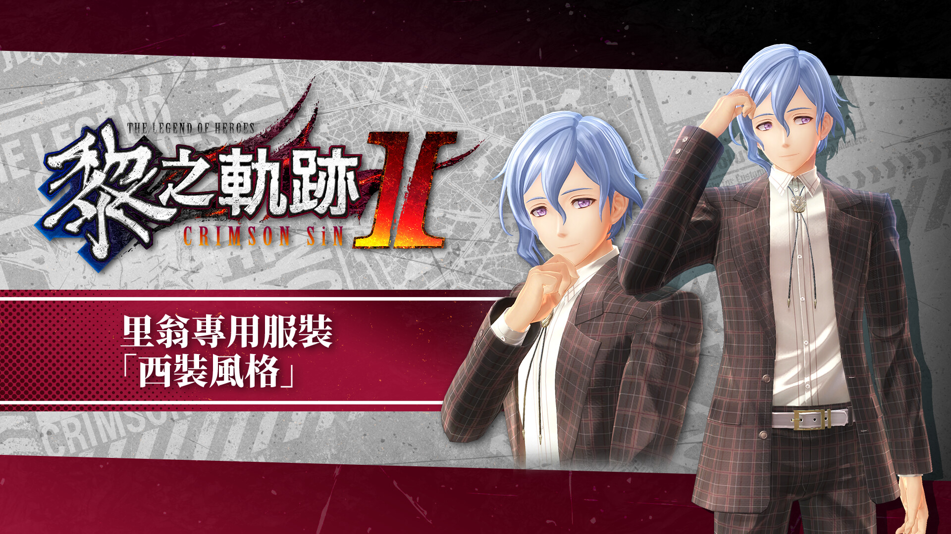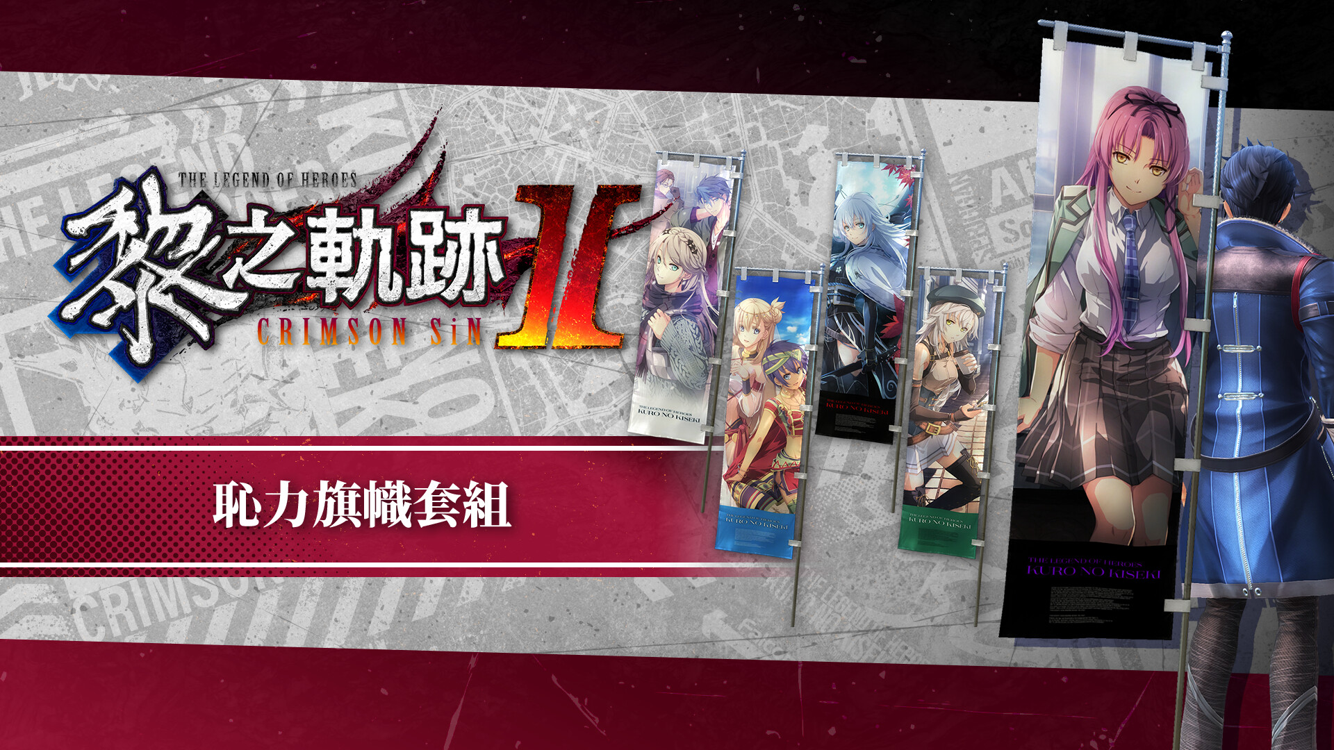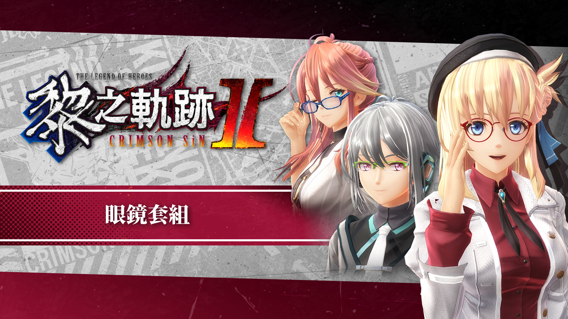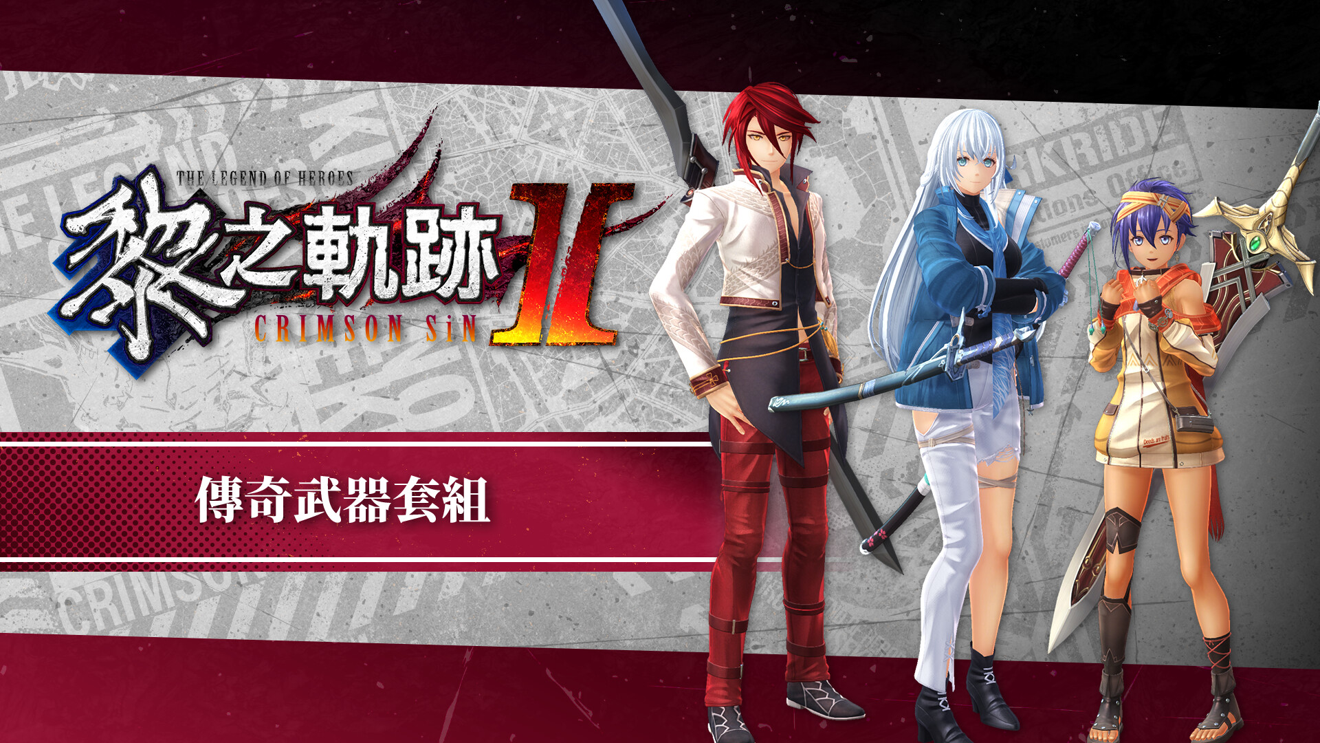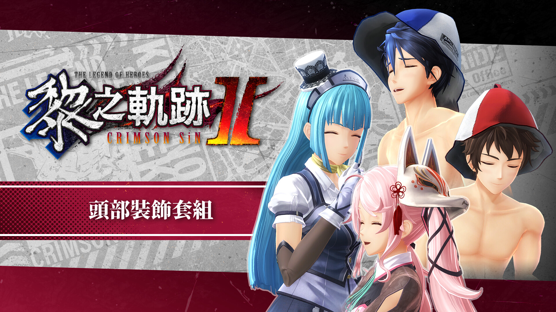 Set of The Legend of Heroes: Kuro no Kiseki II -CRIMSON SiN- DLC items, including costumes and attachment items.