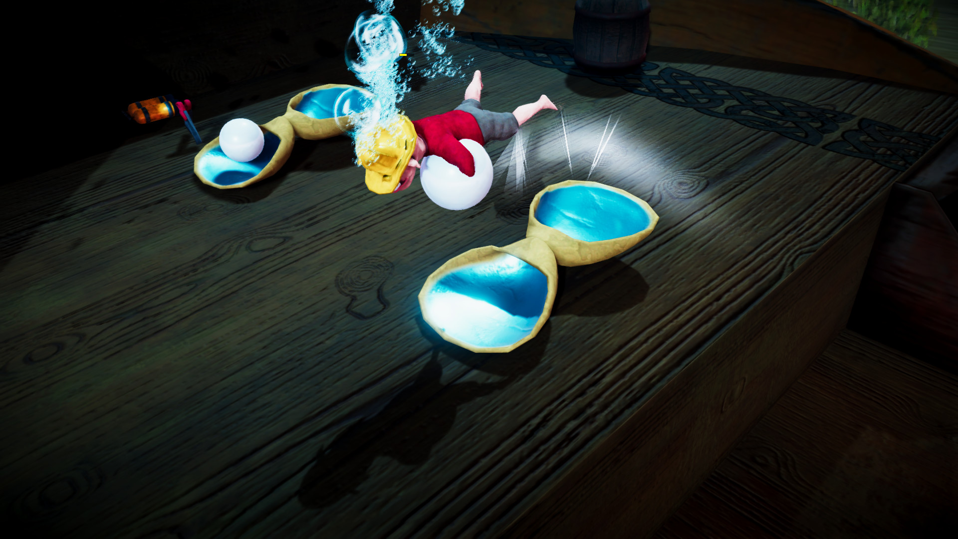 In the minigame Pearl Diver you dive for pearls. Take these out of the water to get points. But be careful, because you have limited breathing air available and your unscrupulous opponents will try to pull you under the water until you run out of air. Collect scuba tanks and flippers to give you an advantage and keep your opponent under the water.