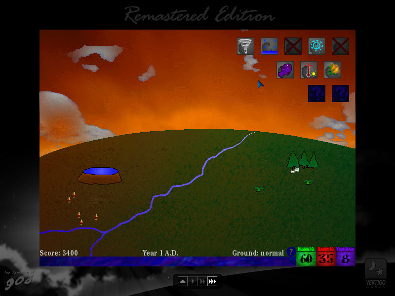 As you progress through the eons of time, you’ll notice that your actions have directly affected the shape of the world simply by the order in which you chose them. By creating the earthquake first, for example, you created a crack in the earth that you could then fill with the flood, which lead to a vast river spanning the planet. But had you done the flood before the earthquake, the ground would not have been dry enough to create the crack, and would have lead to an entirely different landscape. This is just a small example of what your actions do in the Sandbox of God: Remastered Edition, as you start with a selection of actions (such as rain, earthquake, etc.) and must choose the order they are unleashed upon the Earth. Doing these actions in different order can yield new results, and it's up to you to find new ways to shape your world.