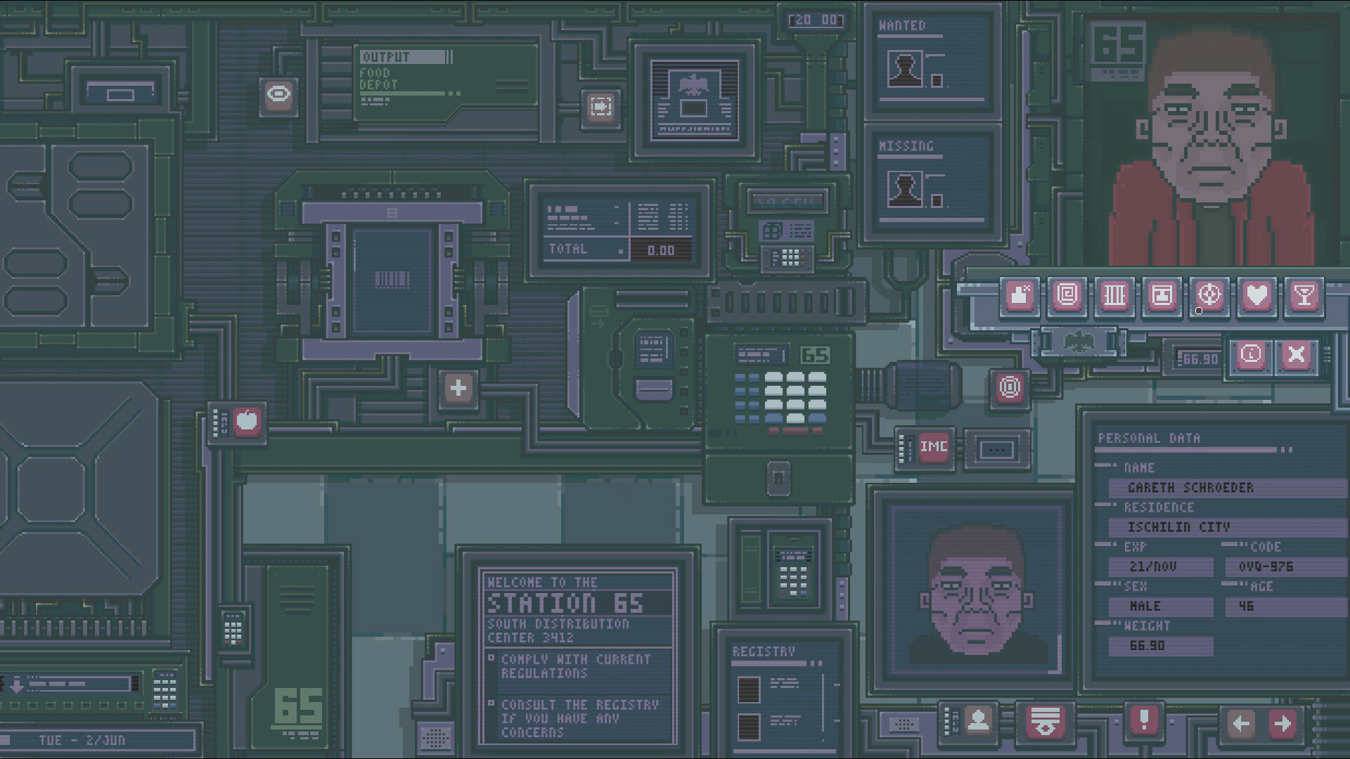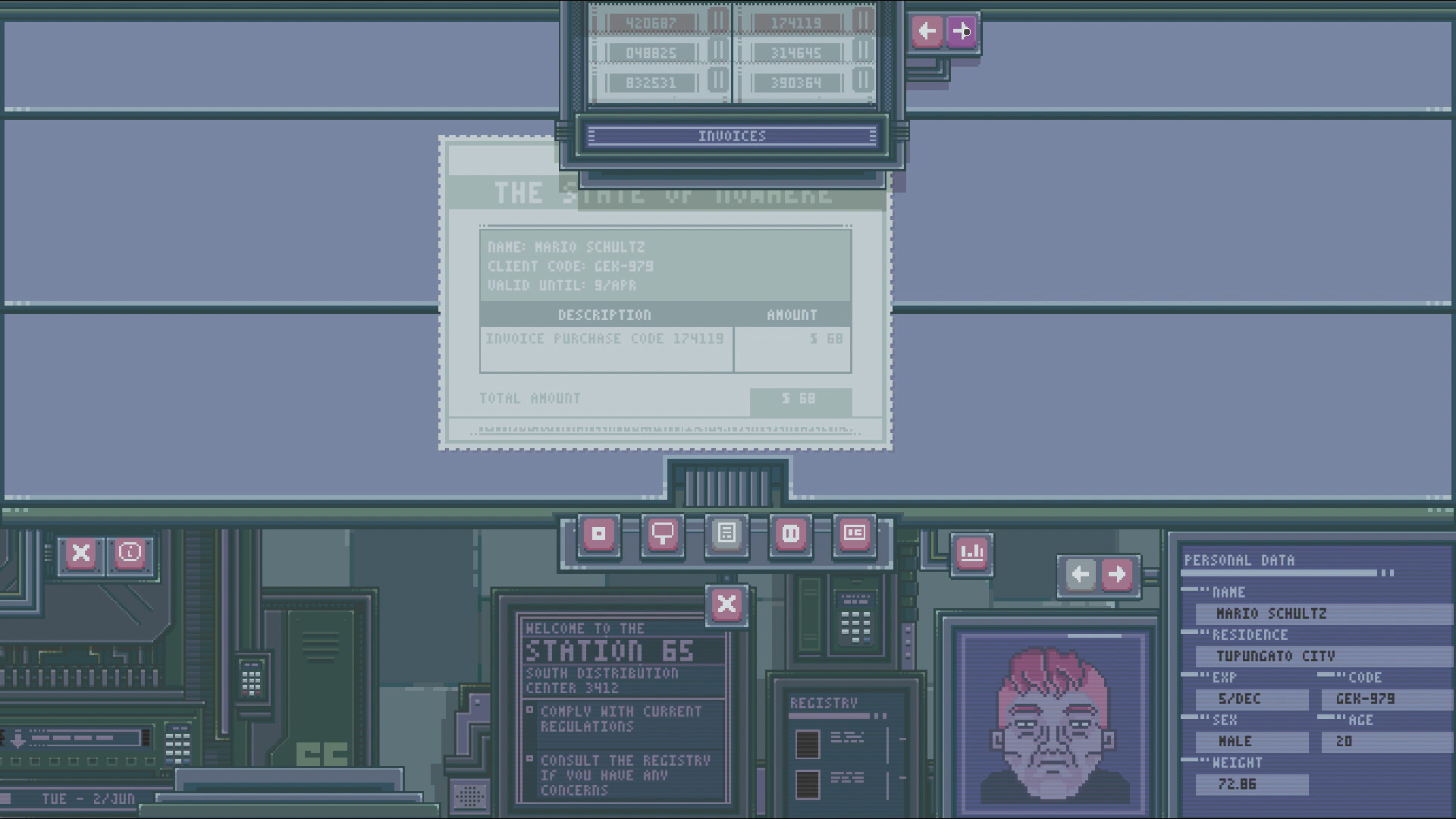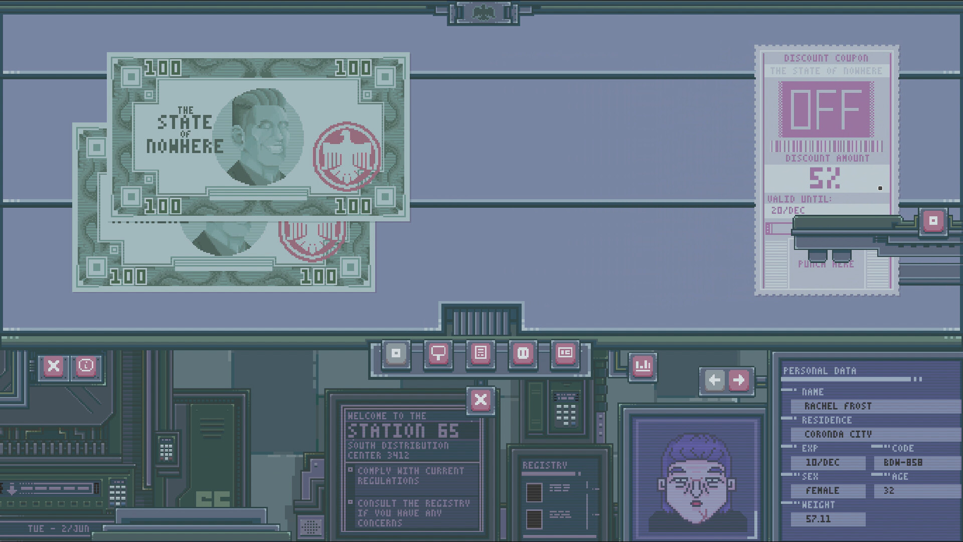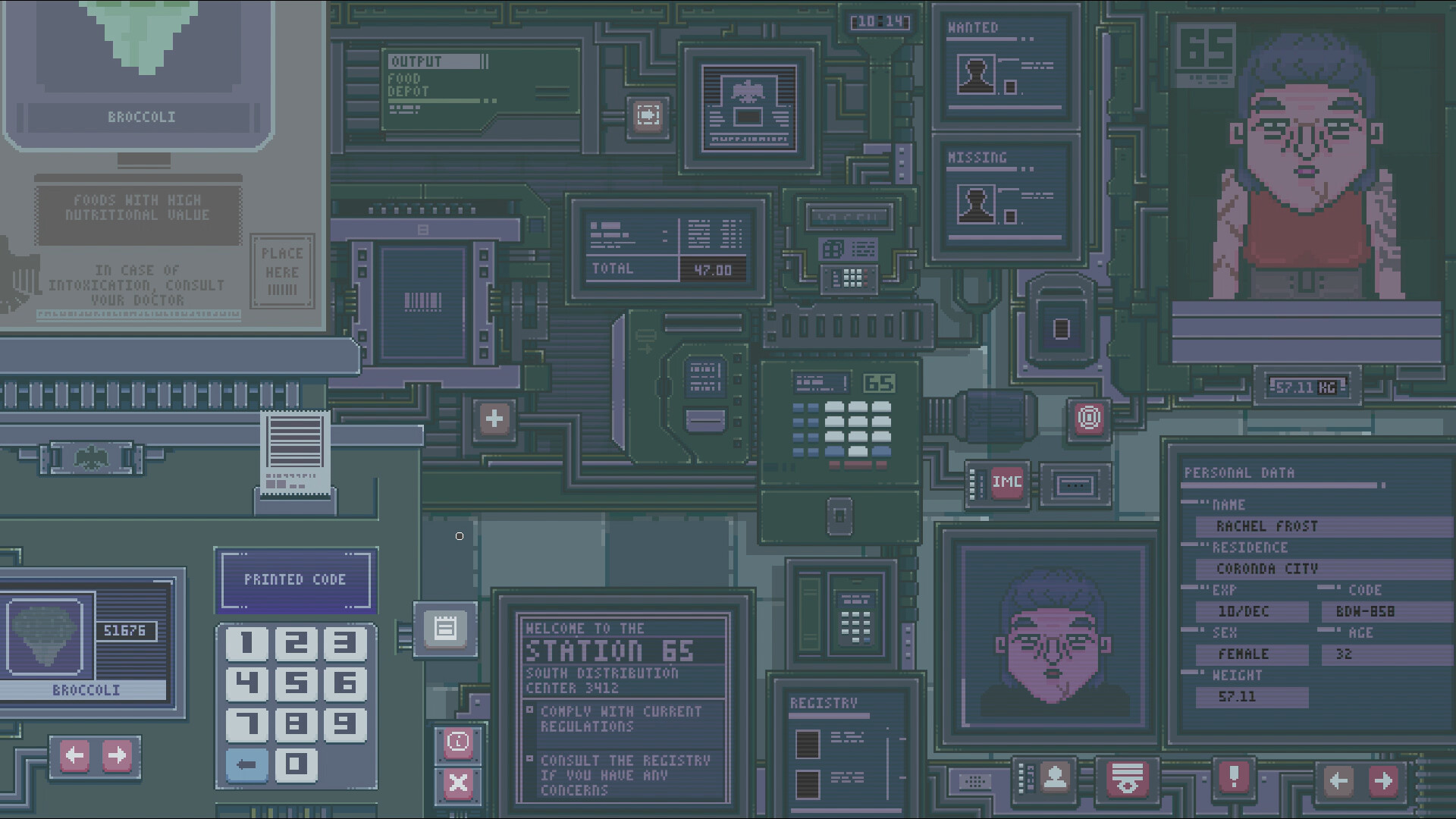 Assigned to station 65, your role as employee 100411 will be to serve and sell products to the people, exercising the controls the state deems necessary to keep the population in line