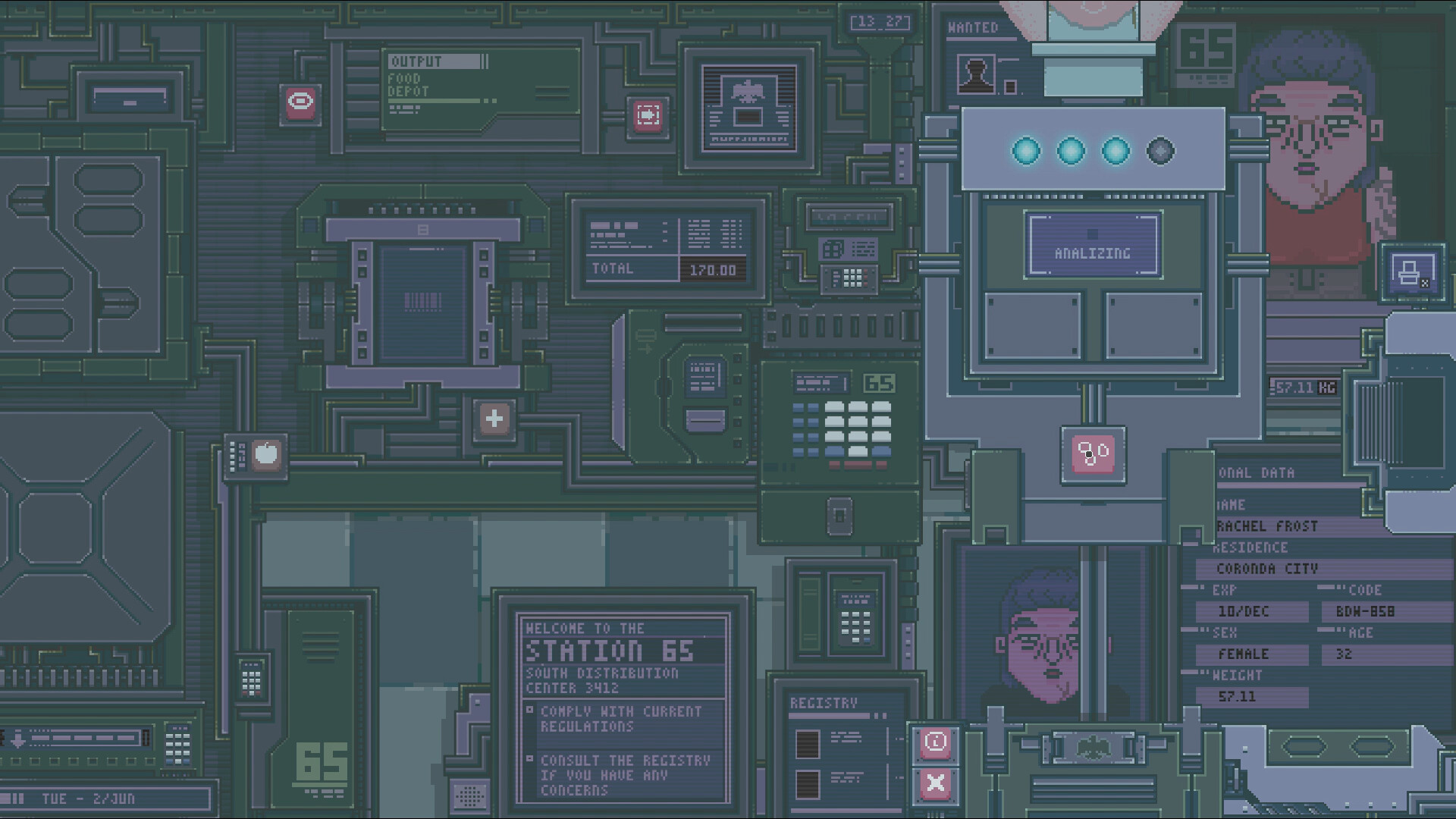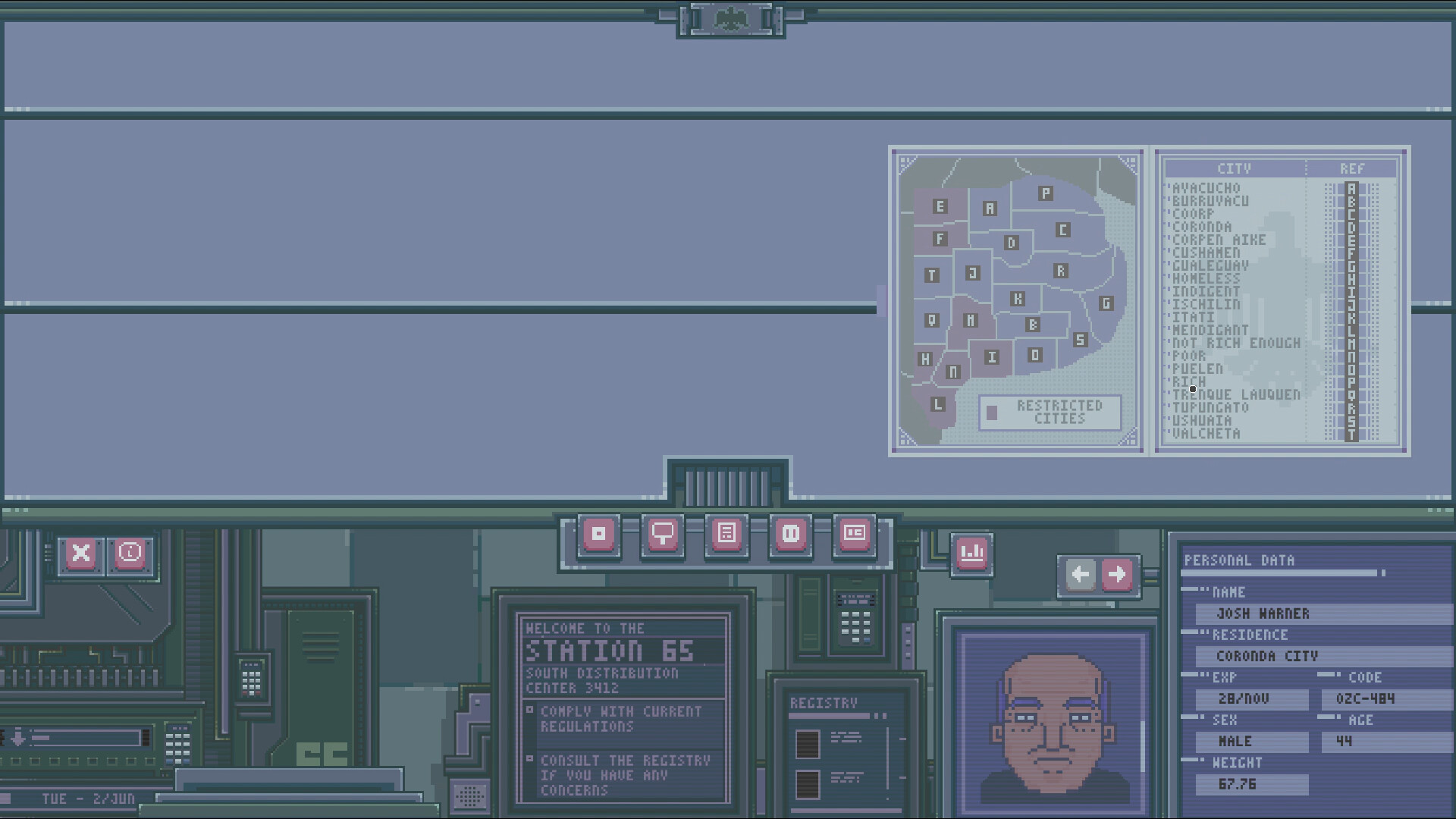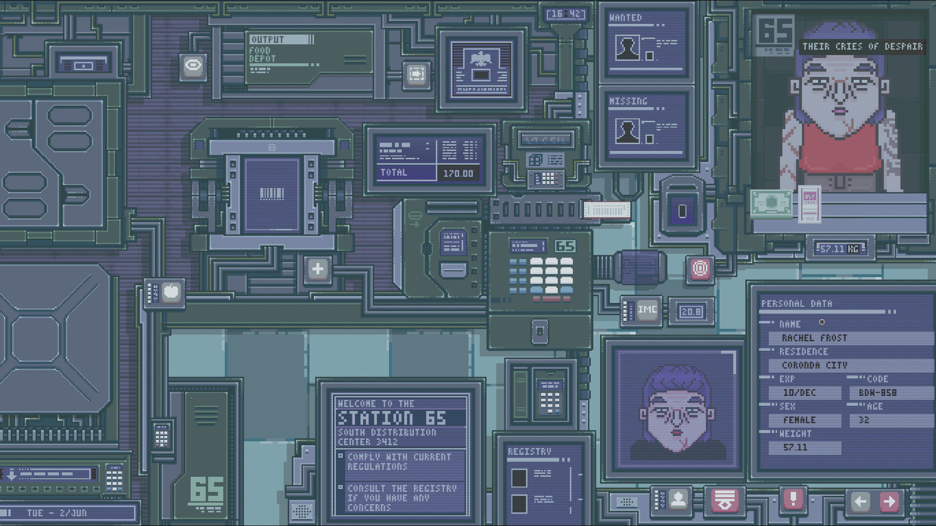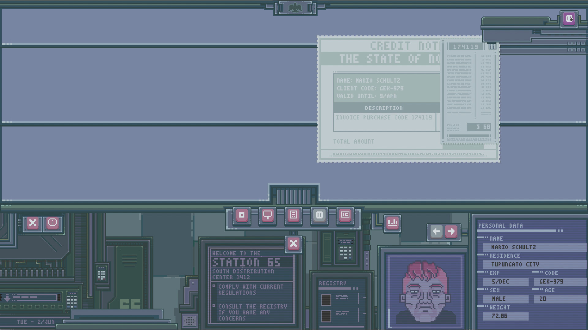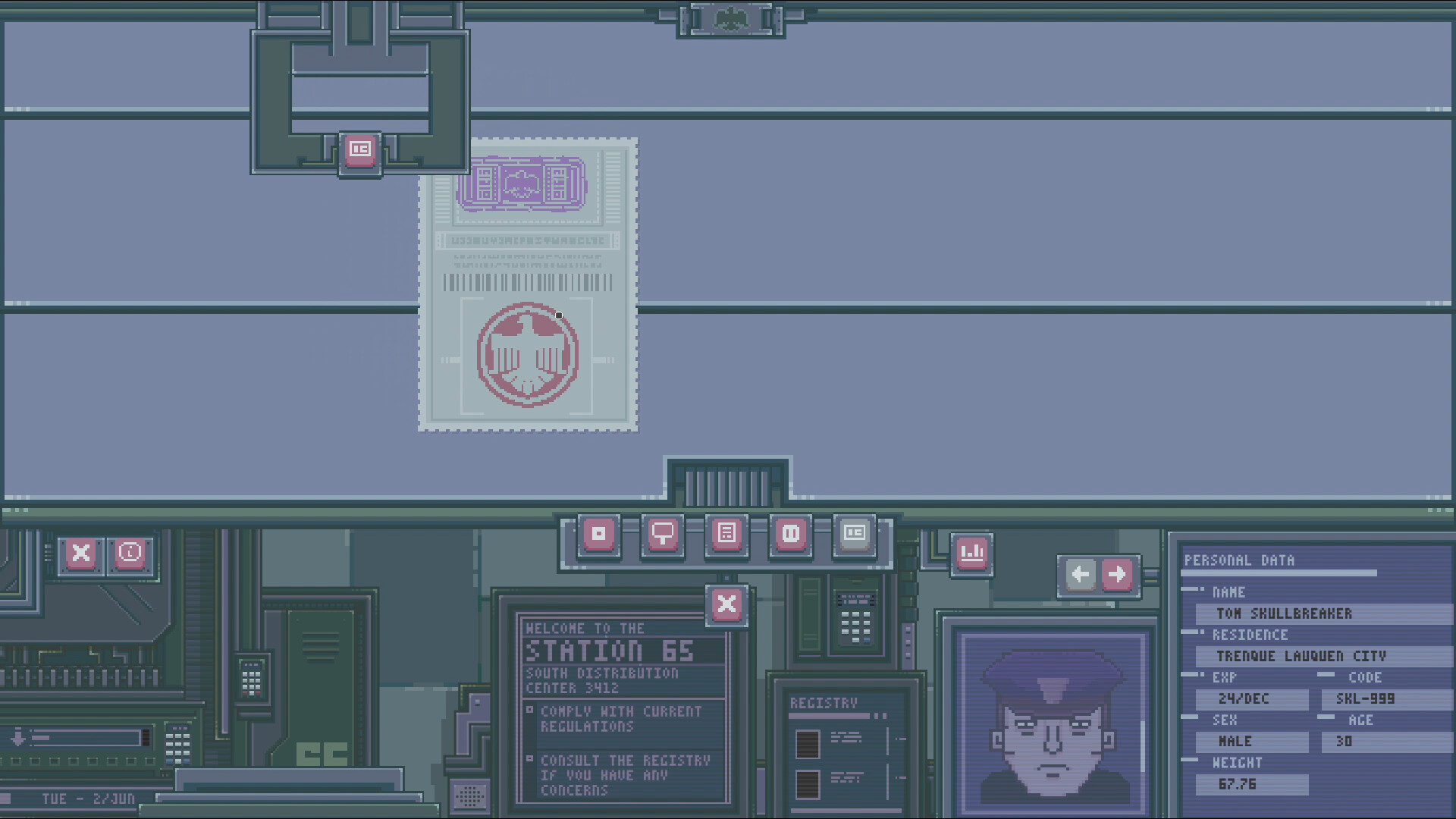 Assigned to station 65, your role as employee 100411 will be to serve and sell products to the people, exercising the controls the state deems necessary to keep the population in line