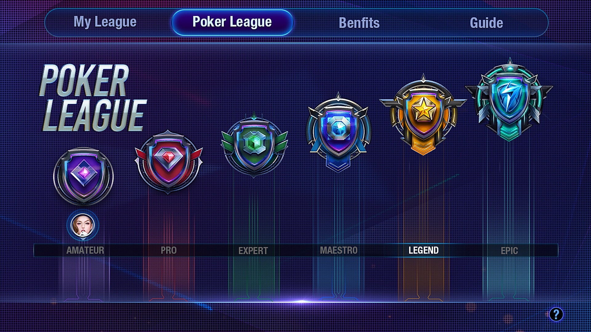 Play Texas Holdem and accumulate League Points to promote weekly or trigger the Fast Track to advance immediately!