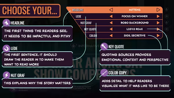 Your choices impact the quality and tone of the story and how both your editors and readers will react to it. Over time, the choices in each story start to shape the reputation and popularity of a holopaper. So hey, no pressure!