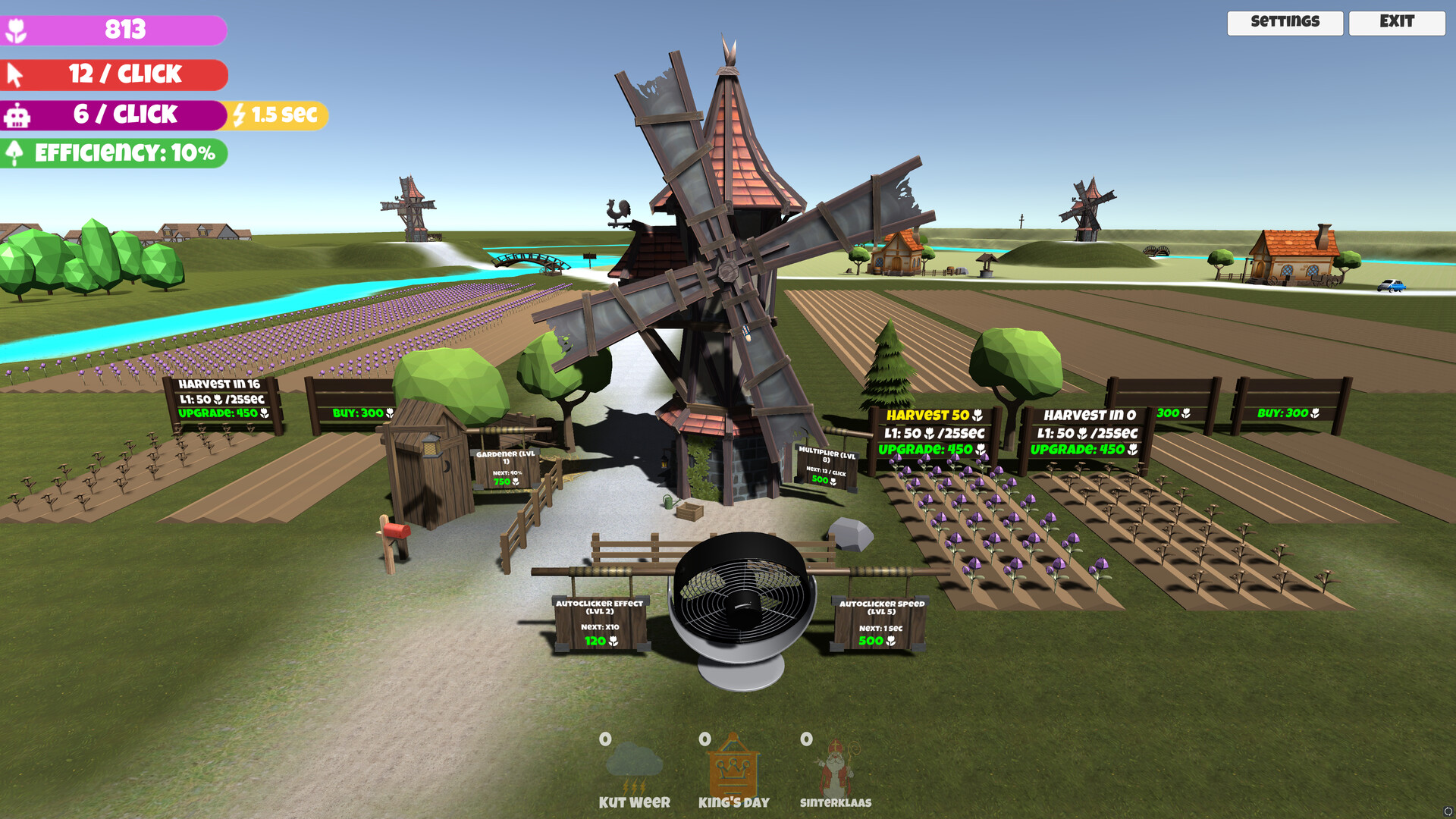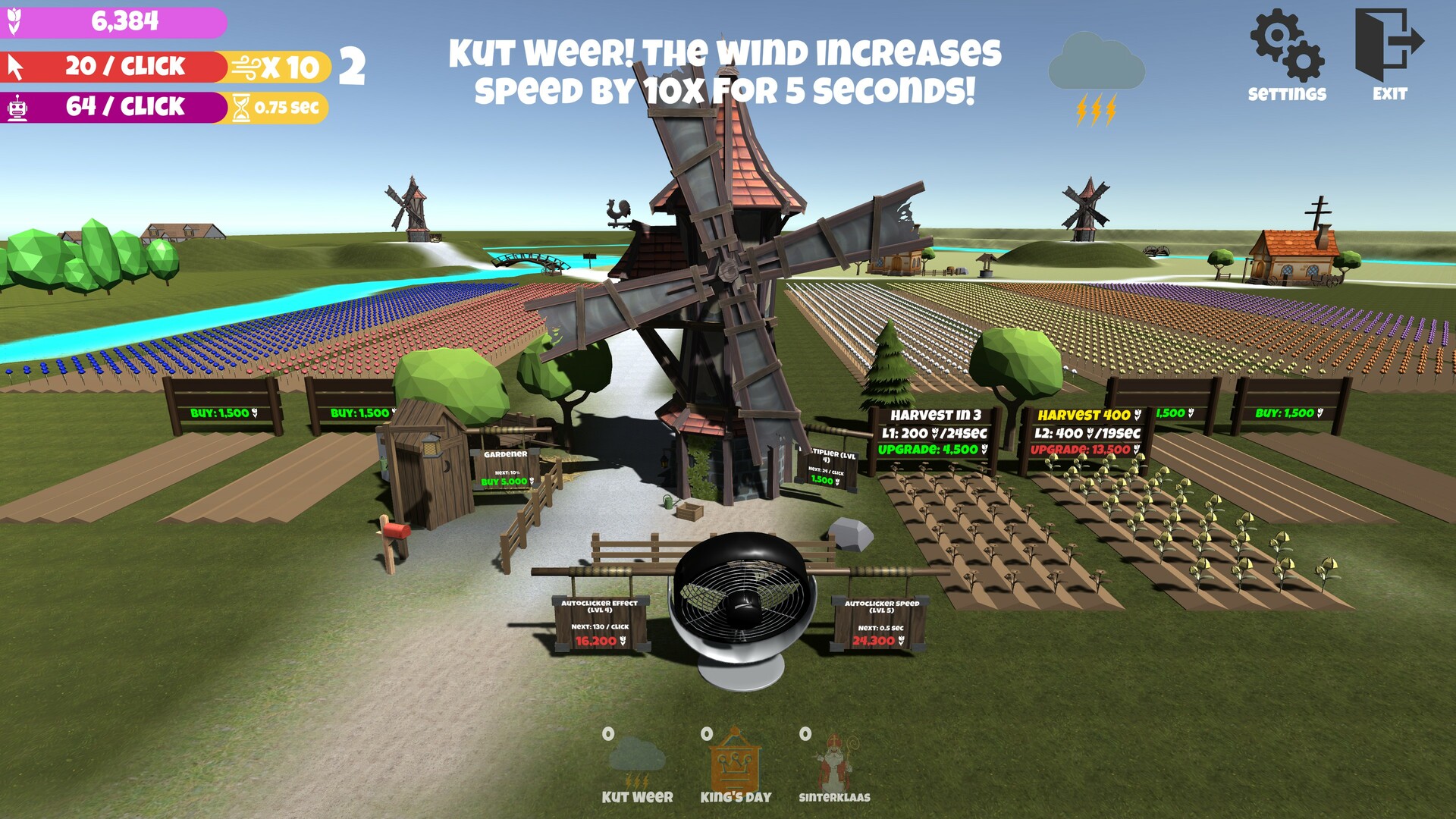 Boost your production with unique Dutch-themed events like King’s Day or brave the infamous Kut Weer! (bad weather) to turn challenges into opportunities. Upgrade your windmill to increase its speed and efficiency, and watch your tulip fields flourish with ever-growing profits. With every decision, you’ll get one step closer to creating the ultimate Dutch tulip dynasty!