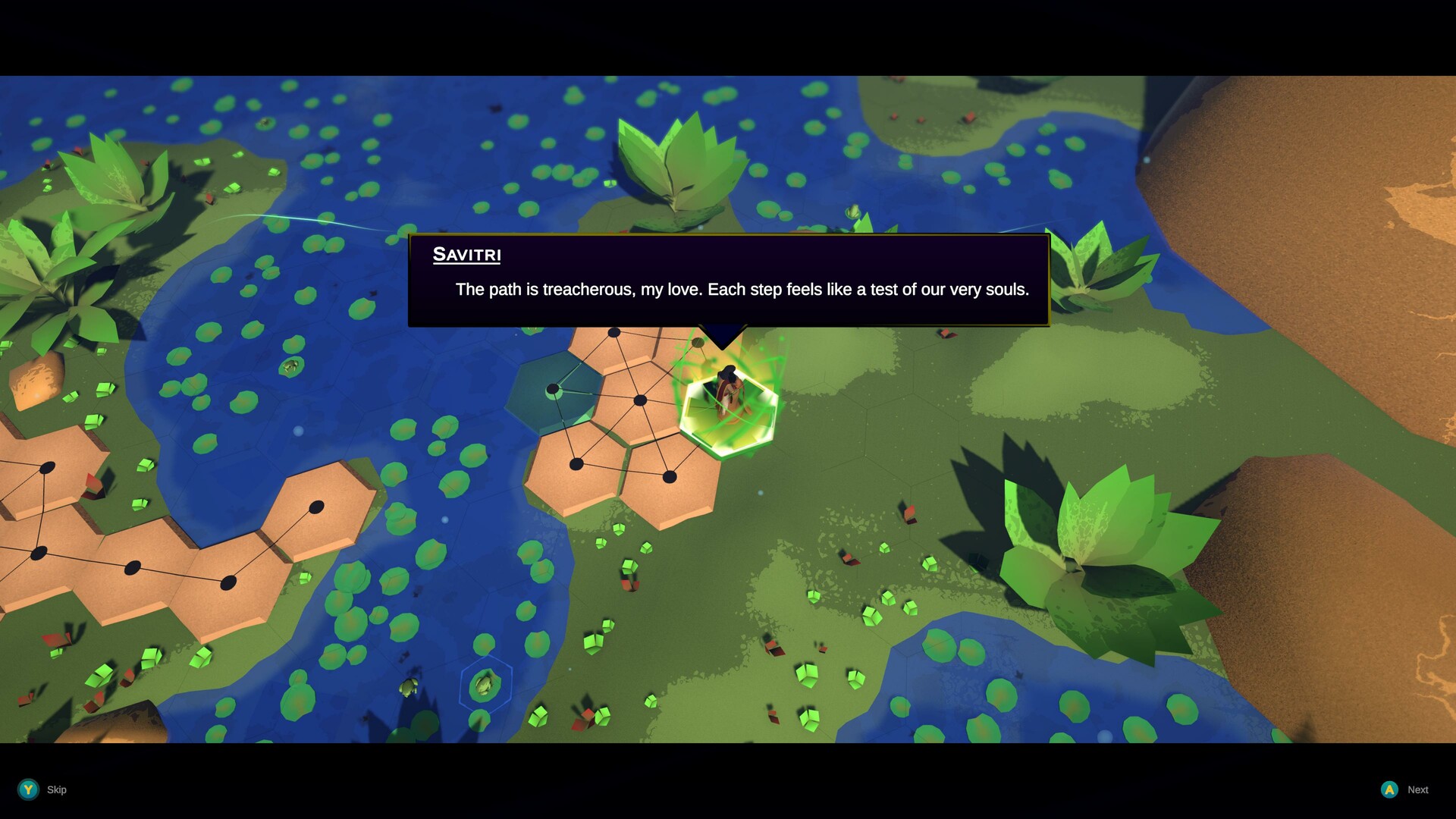 Control two characters - Move Savitri and Satyavan on a shared hex-grid and solve puzzles by positioning both correctly.